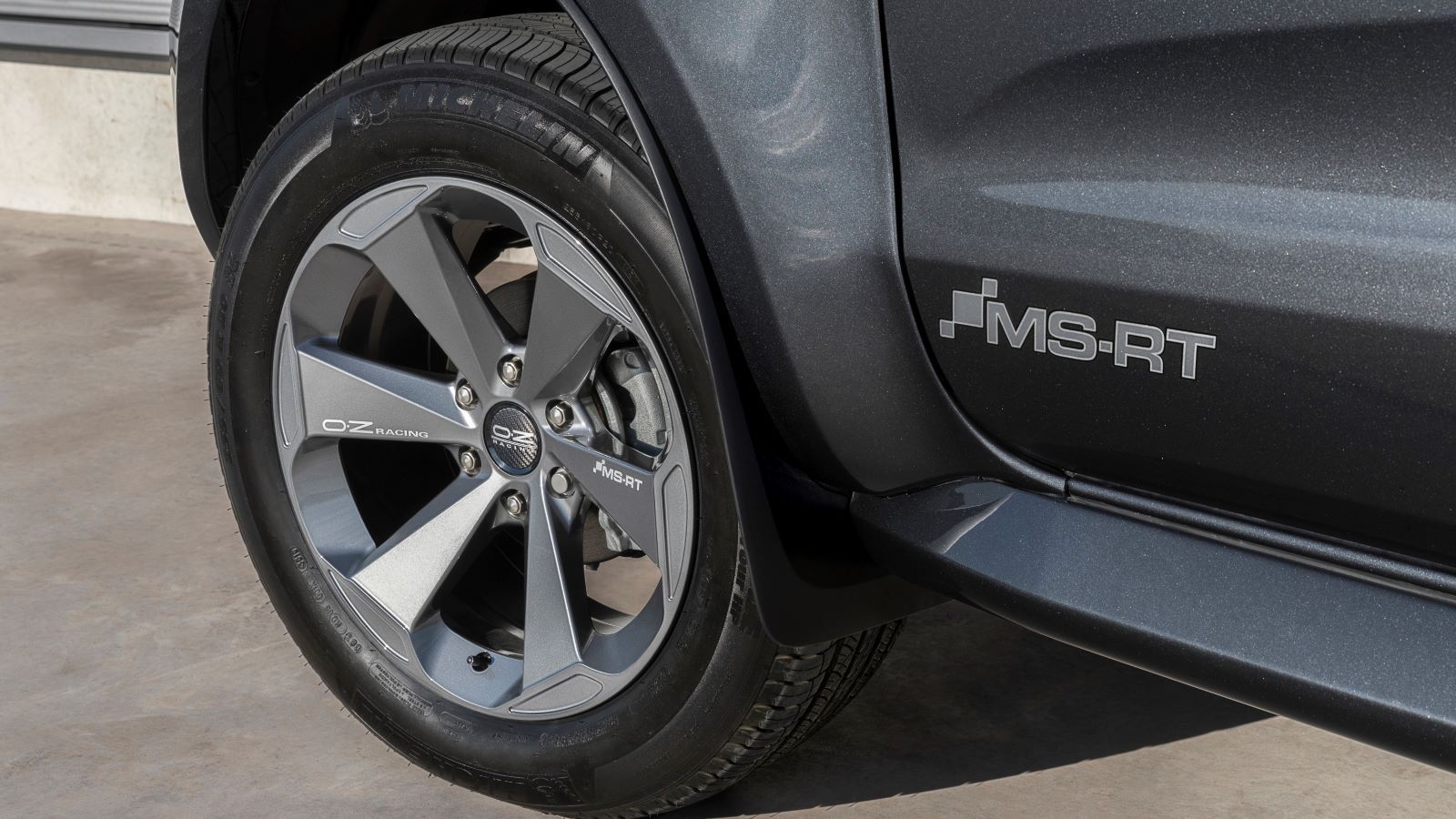 The Ranger MS-RT is based on the Ranger Wildtrak and is available in SuperCab or SuperCrew configuration. To that base, Ford added a hand-built front fascia featuring a honeycomb carbon fiber-effect grille and integrated fog lights, 20-inch OZ Racing alloy wheels, extended wheel arches, sculpted side skirts, carbon fiber-effect mirror caps, an aerodynamic load bar, and MS‑RT badges. Color choices include Frozen White, Sea Grey, or Agate Black.