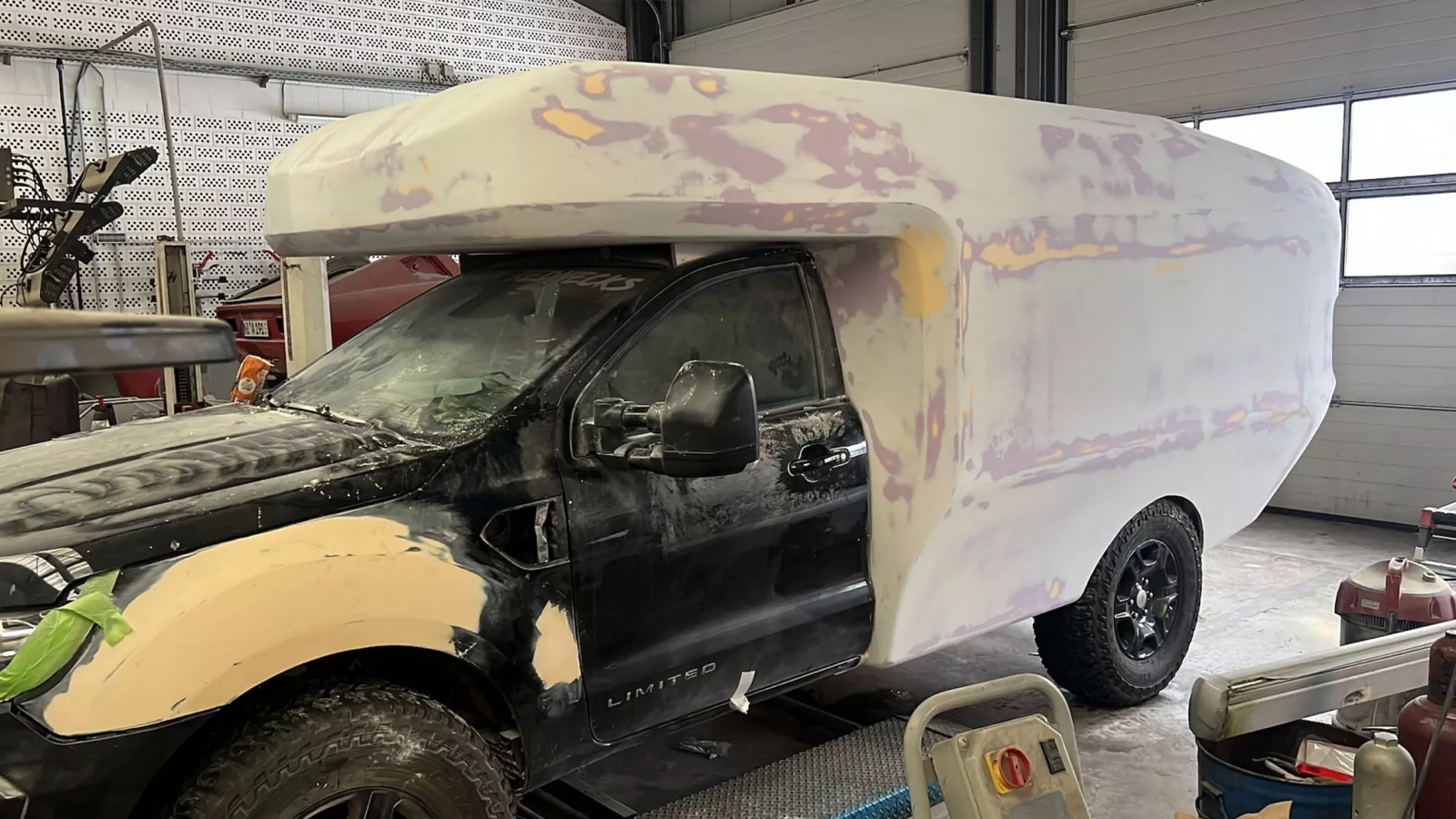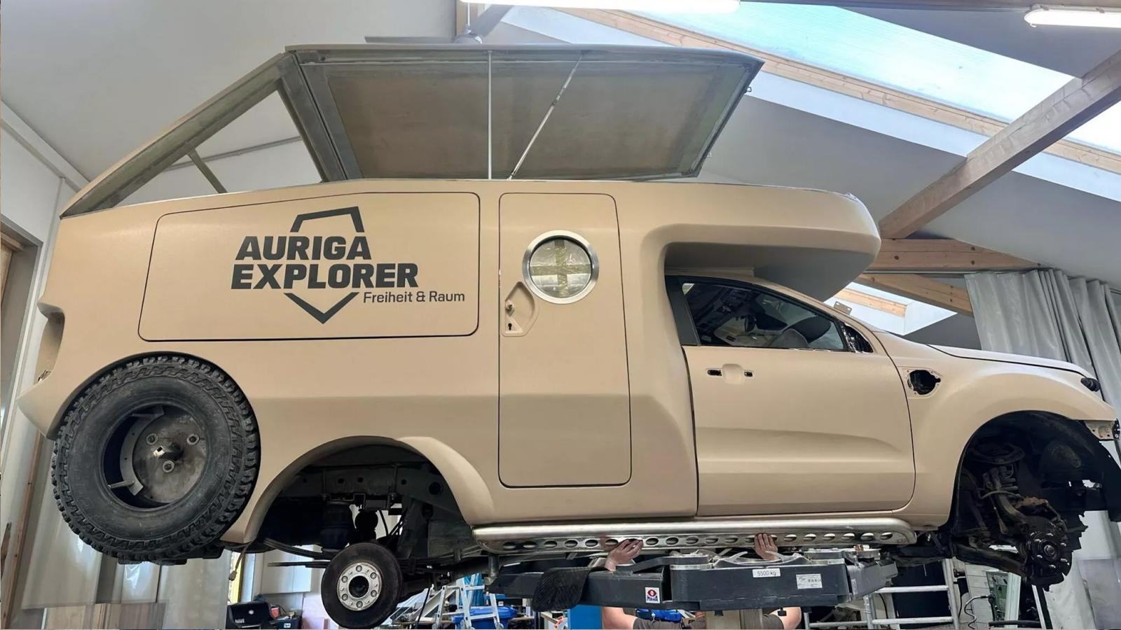 At first glance, the Voyager’s dual spare tires and extended overhang give it a six-wheeled look. Combined with raised suspension, wide fenders, and grippy off-road tires, the rig clearly targets serious adventurers. Beneath the surface, the truck’s rear end has been replaced with a lightweight GRP (glass fiber reinforced plastic) shell that incorporates the original taillights and mounts directly to the Ranger chassis. Despite the modifications, the total weight stays below 7,716 pounds (3.5 tons), keeping it within common licensing limits in Europe.