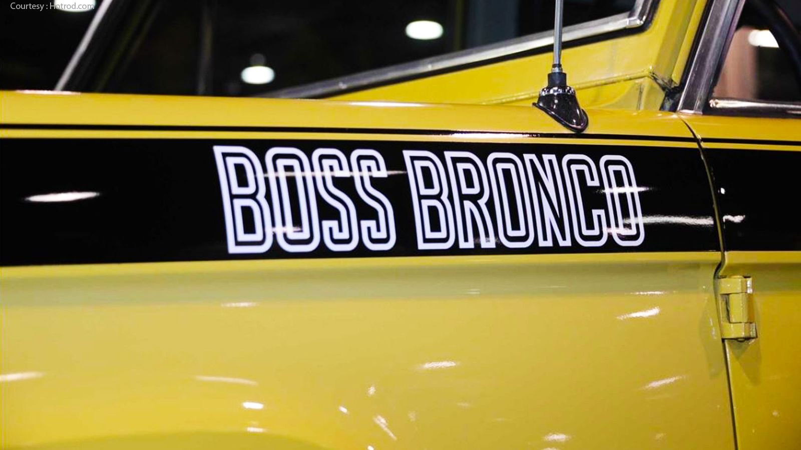 On the outside, the rear wheel wells were cut and Stroppe fender flares installed to provide tire clearance. A Cougar Eliminator hood scoop was bolted onto the hood, and finally, black hockey-stick stripes with special BOSS BRONCO lettering were applied.