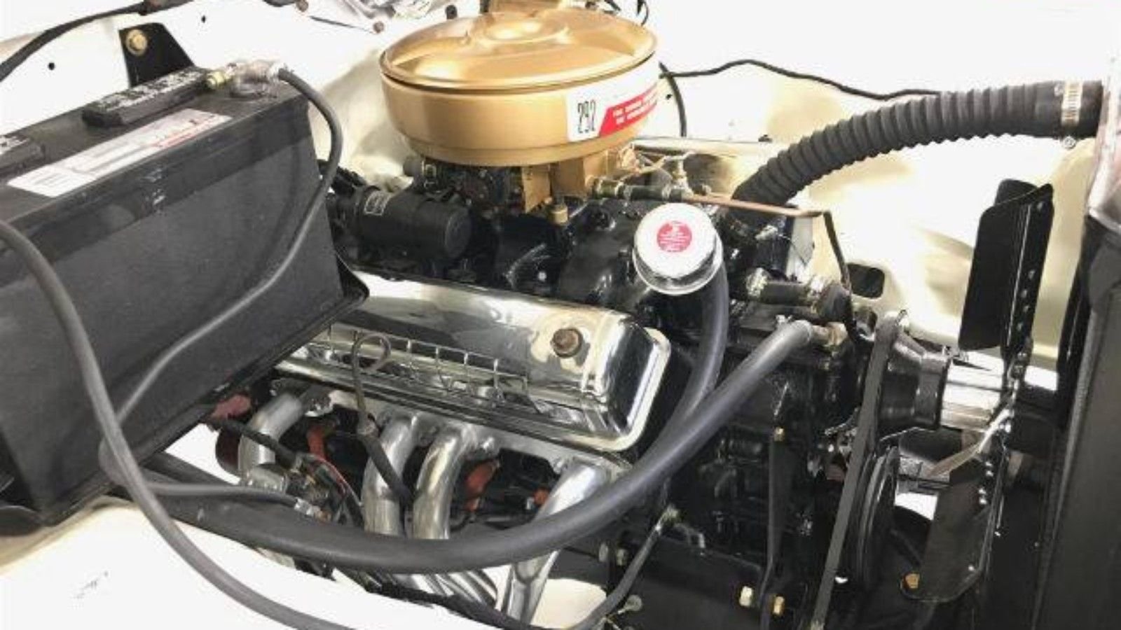 Under the hood of this beautiful machine, you'll find a 292 cubic-inch V8 engine. It has been treated to a few upgrades, including headers and a dual exhaust, both of which have been heat-treated and jet coated. Backing up the engine is a Borg Warner T98 4-speed manual transmission.