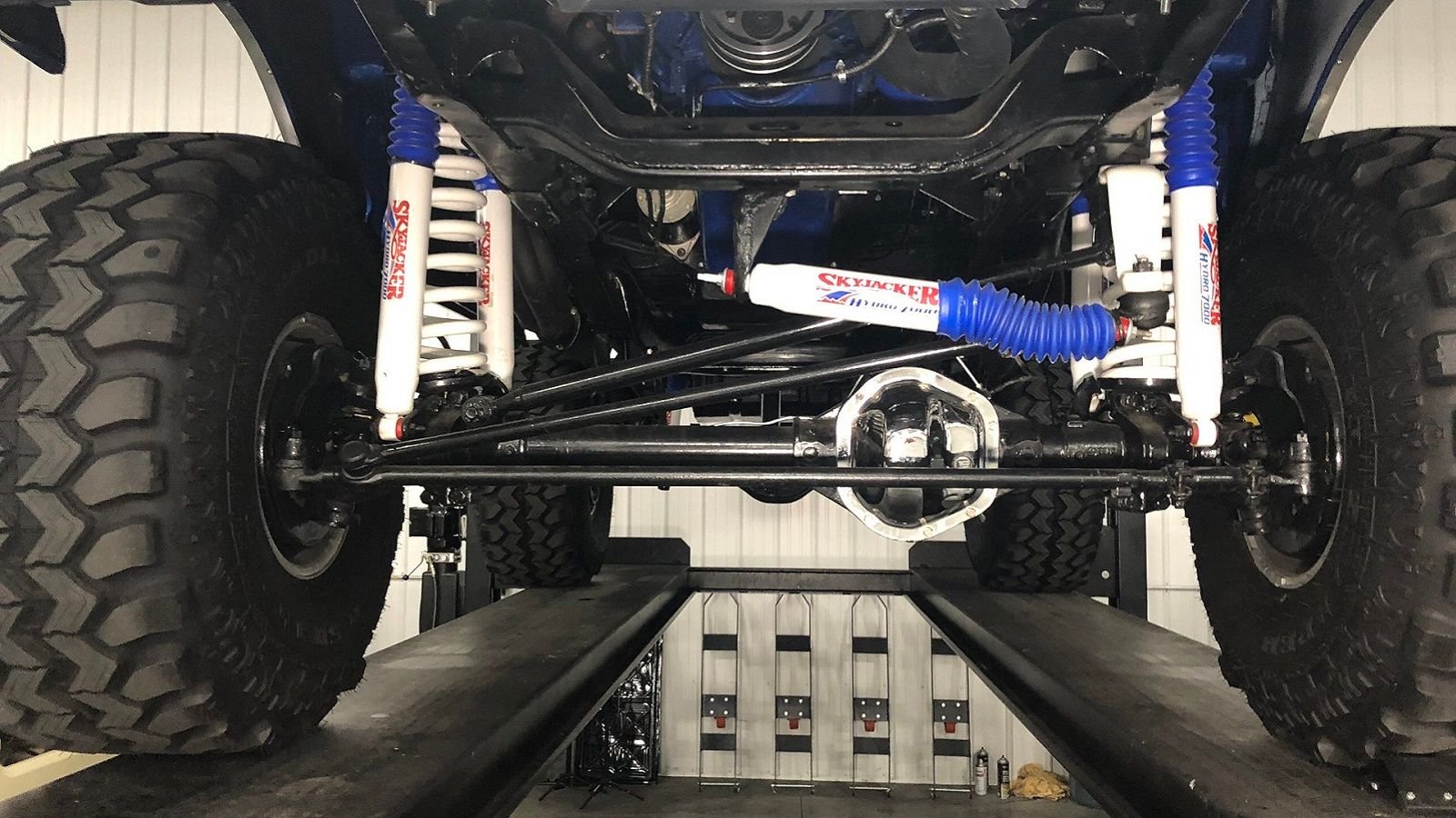 Next, you'll want to crawl underneath this bad boy to truly appreciate what it has going on there. Of course, you don't really have to crawl given how high up it sits. But there, you'll find custom driveshafts, rebuilt differentials, and a combination 6-inch suspension lift and a 2-inch body lift.