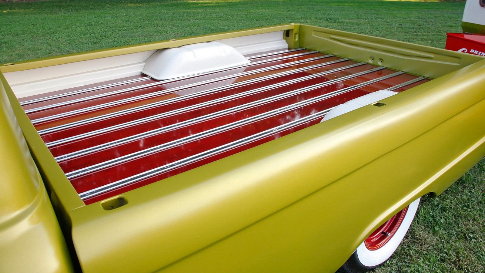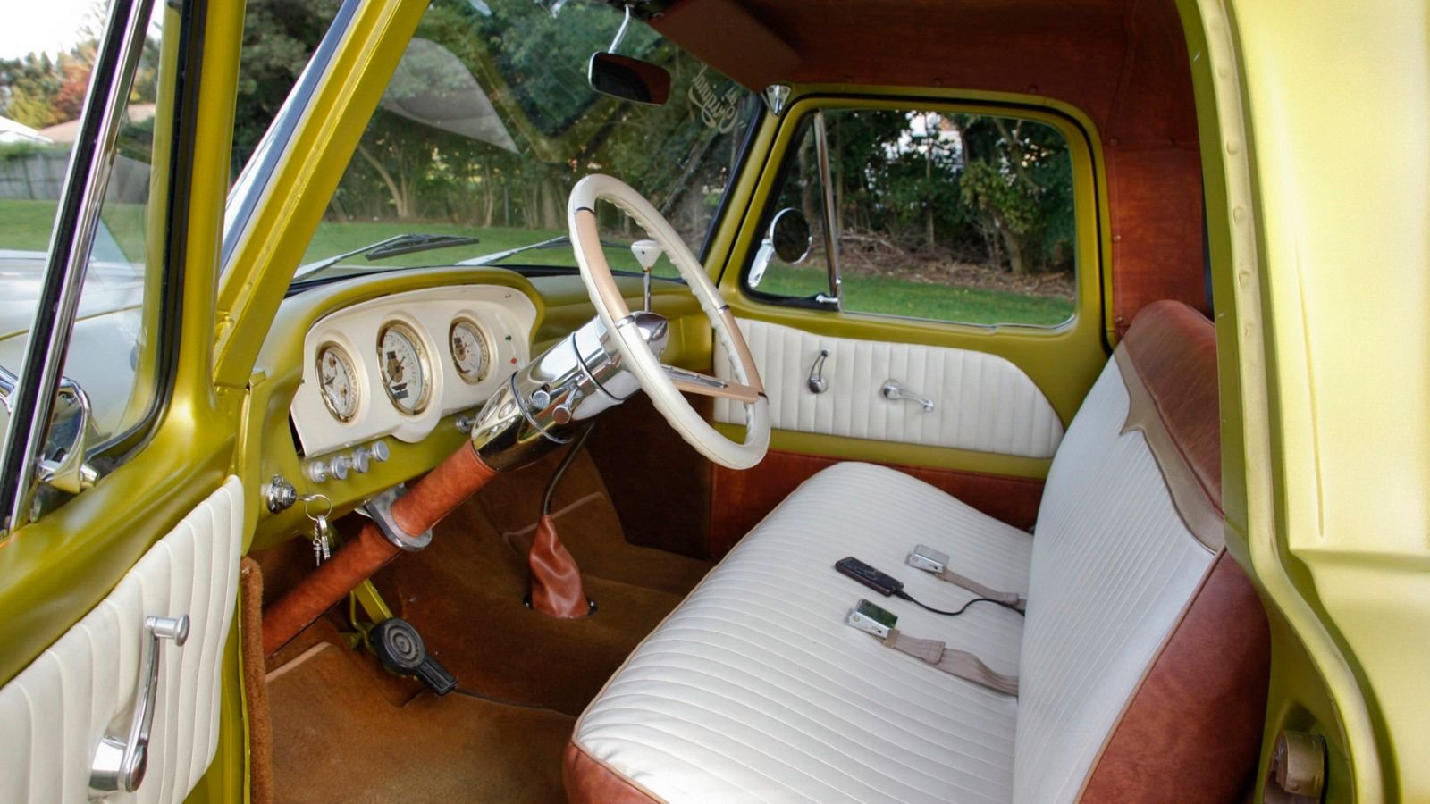 The theme even continues under the hood, where you'll find smoothed and white-painted fender wells and firewall. Those Vanilla Pearl accents perfectly complement the rest of the truck, which is painted in a base-coat green/gold metallic paint with a satin clearcoat.