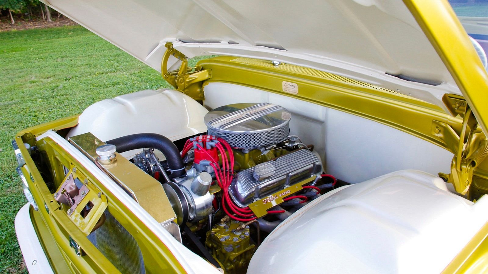 The F-100 itself is a bit of a restomod. Under the hood, you'll find a rebuilt, fuel-injected 302 V8 dressed up with aluminum finned valve covers and air cleaner. It's been treated to all kinds of modern stuff to keep it reliable, including an Edelbrock E Street Series fuel injection system, MSD ignition, and Champion radiator.