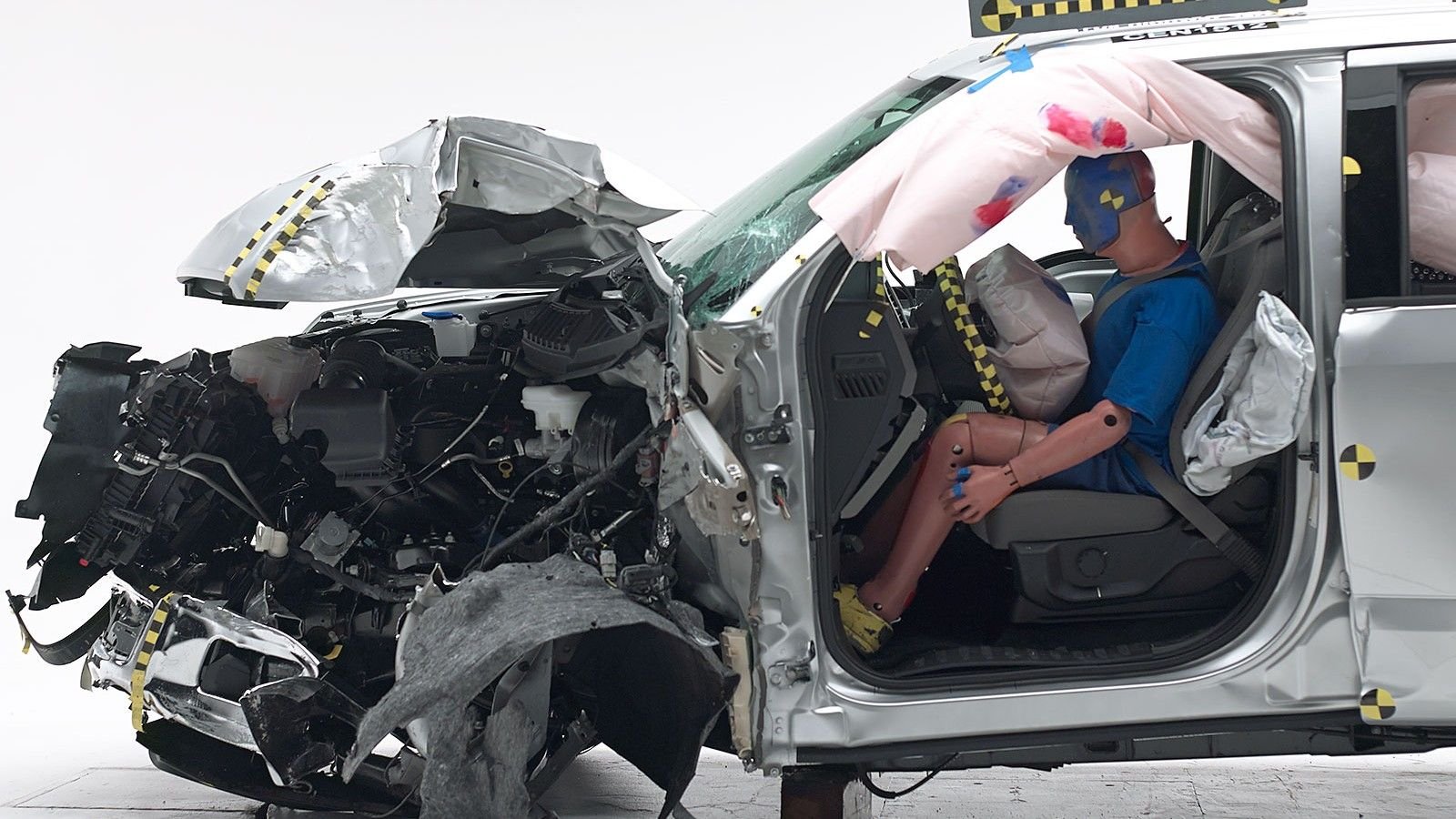 With pick-up trucks, the passenger-side small-overlap front crash test can often fold the wheel in such an angle that suspension structure could pose a risk for occupants. In this post-crash image, you can clearly see that the F-150's wheel and suspension structure remains much in the same place.