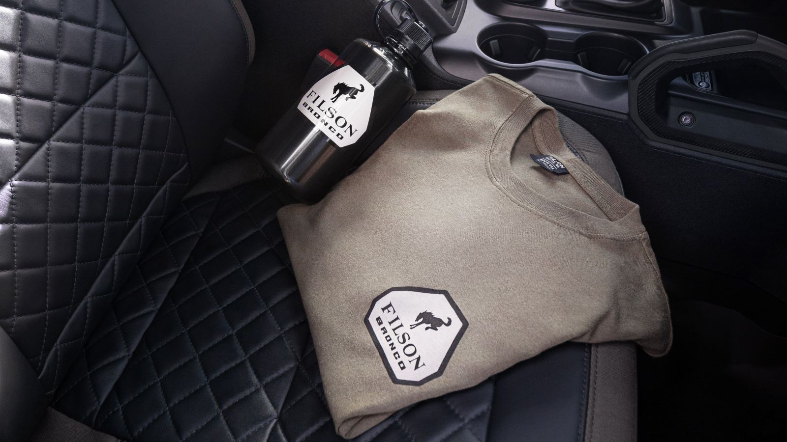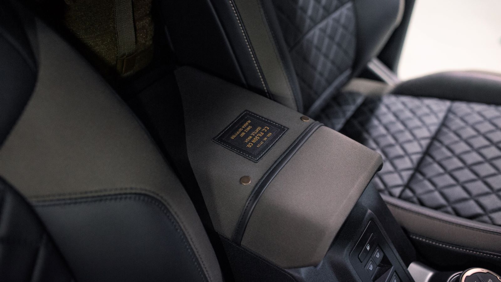 On the inside, Filson's signature materials can be found virtually everywhere, including tough otter green duck canvas on the door bolsters, armrests and seat trim surrounds, plus quilted black leather seats, inspired by Filson’s jacket lining, with embossed Bronco logos. The grab handles on the instrument panel and center console are painted in matching Filson otter green as well.