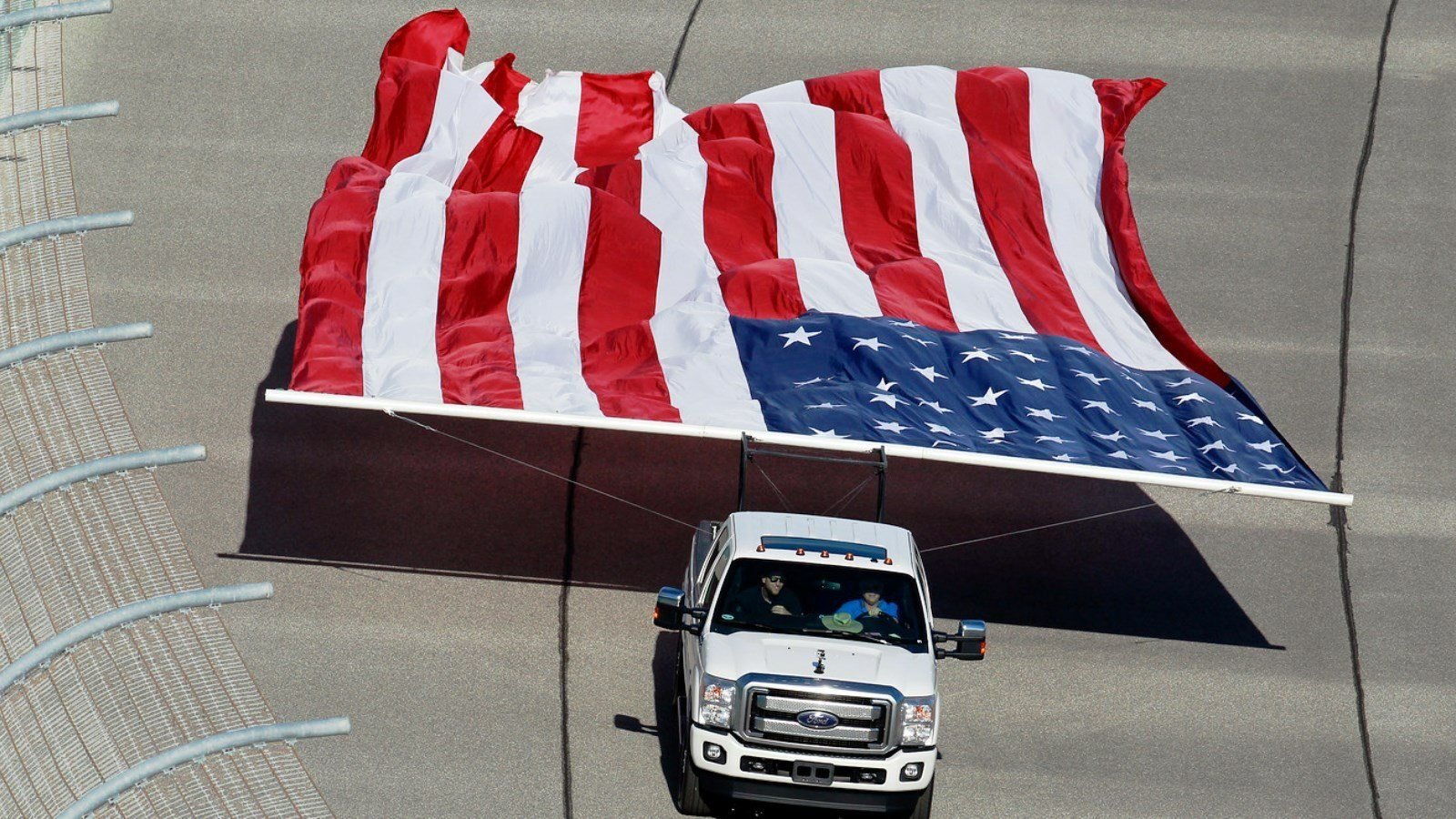 This may be the largest flag ever flown from the back of a truck, and it was towed by a Ford at the NASCAR EcoBoost 400 in 2014. You'll notice that's a Super Duty truck because there is so much American pride at a NASCAR race an F-150 can't handle it.