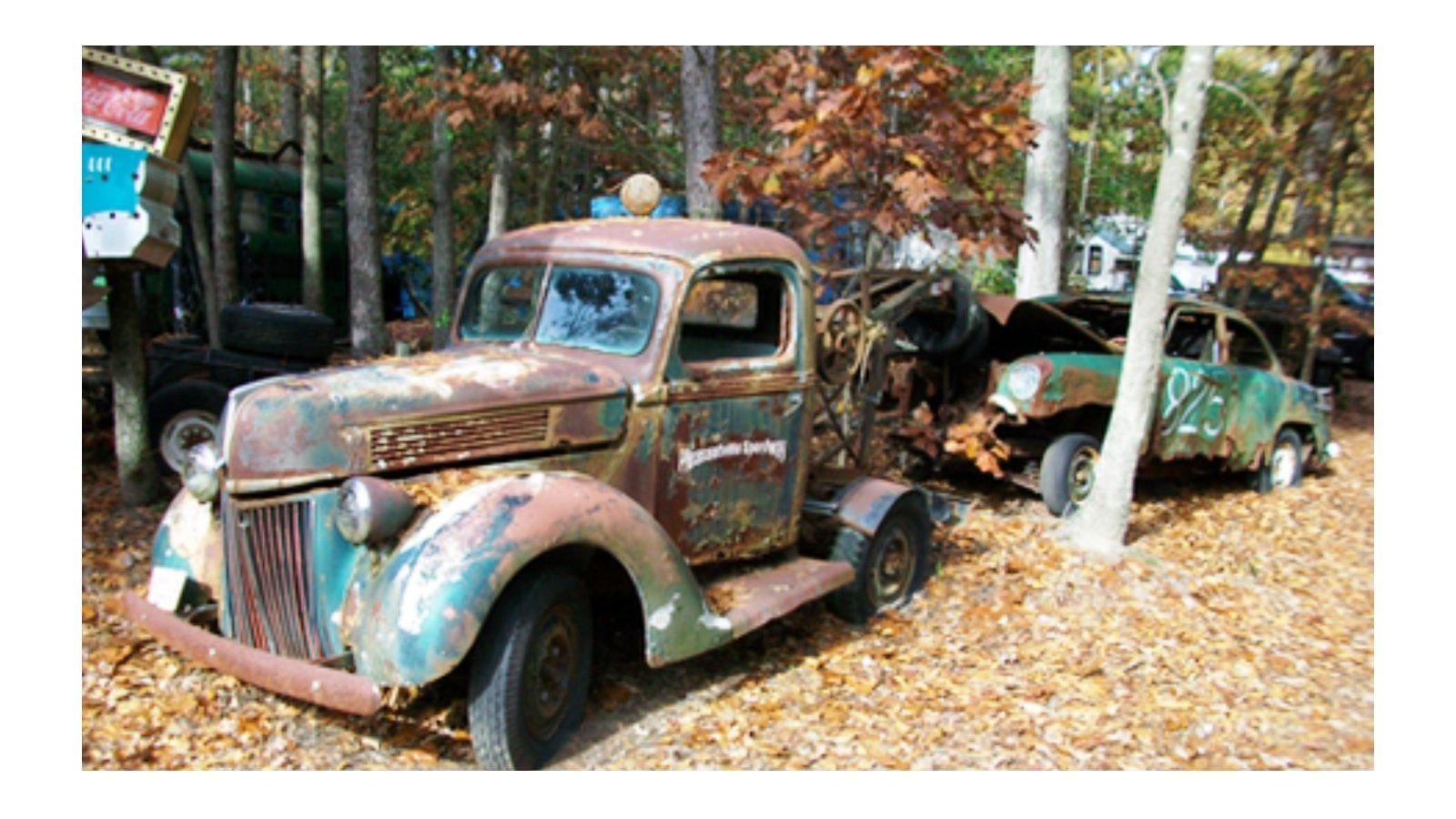 Who can say what happened here? It appears the site was abandoned right in the middle of a stock car race. At least it appears, this 1940s truck managed to stay in service until the 1960s when the 1950s sedan it is hooked to were commonly seen tearing up the stock car tracks. Perhaps the ghosts of county fairground dirt track drivers still haunt the place?