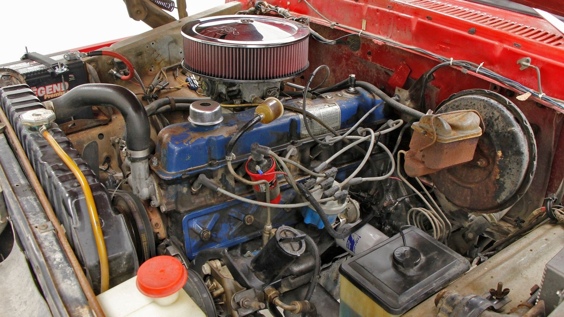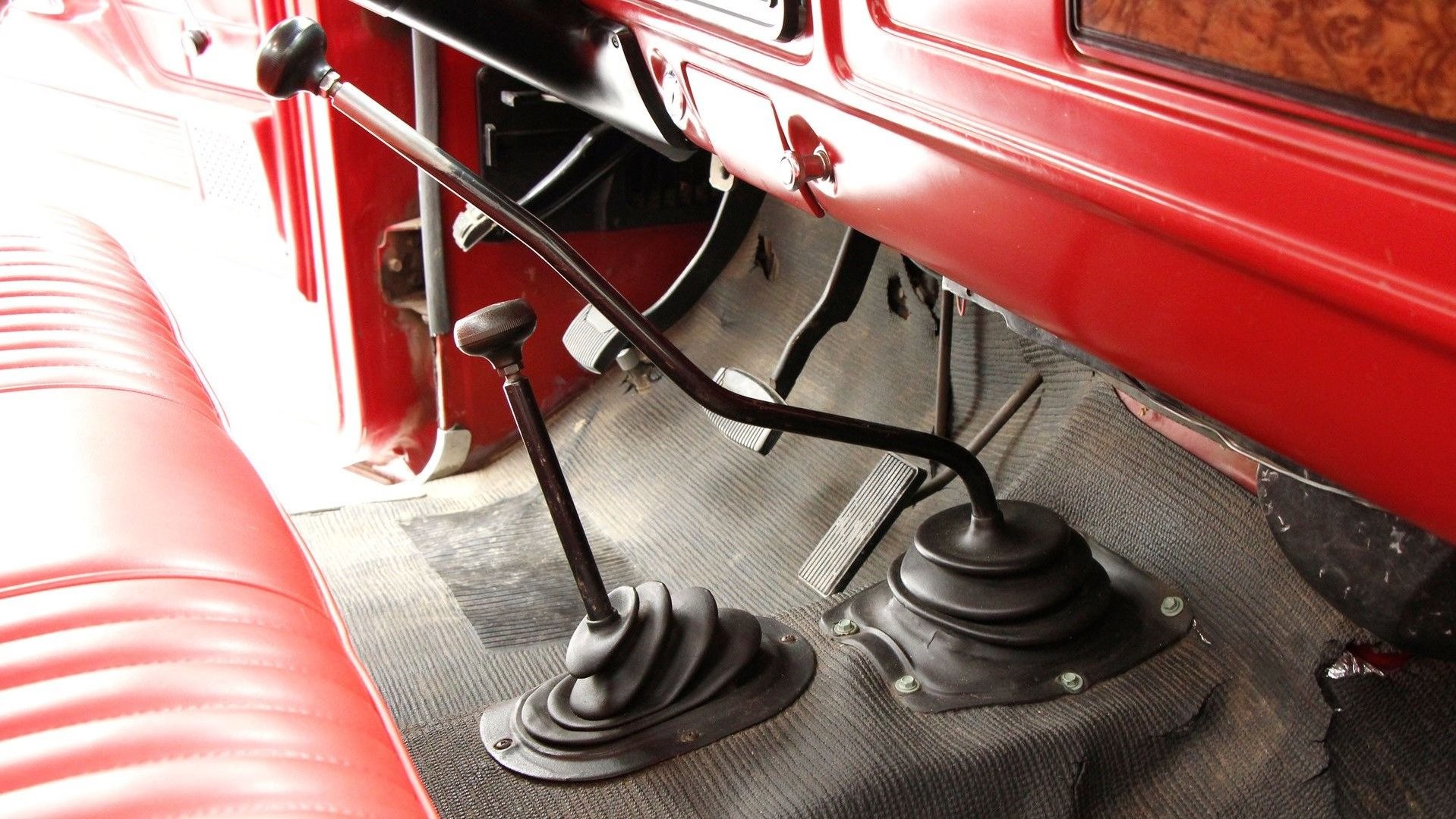 The interior of the F-150 is pretty clean, however. The red bench seat was recovered at some point, but everything else is original save for an aftermarket radio. We would have expected to see some cracks in the dash at the very least, but that doesn't appear to be the case here.