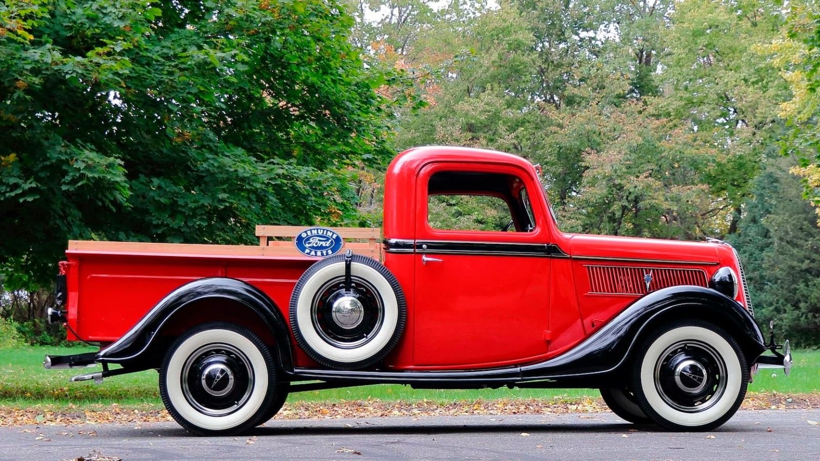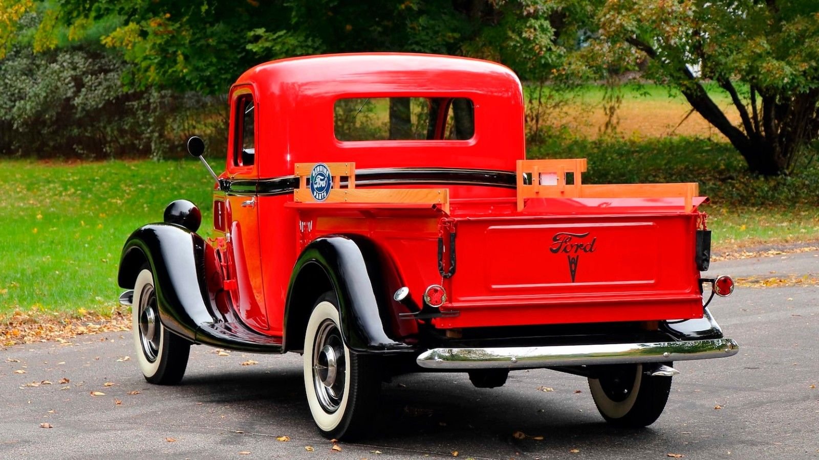 Backing up the V8 is a three-speed manual transmission with a floor-mounted shifter. In the rear, you'll find a steel floored bed with beautiful woodwork. On top of the bed lies custom-crafted oak bedside rails, which are topped with Genuine Ford Parts stamped-steel signage on both sides.