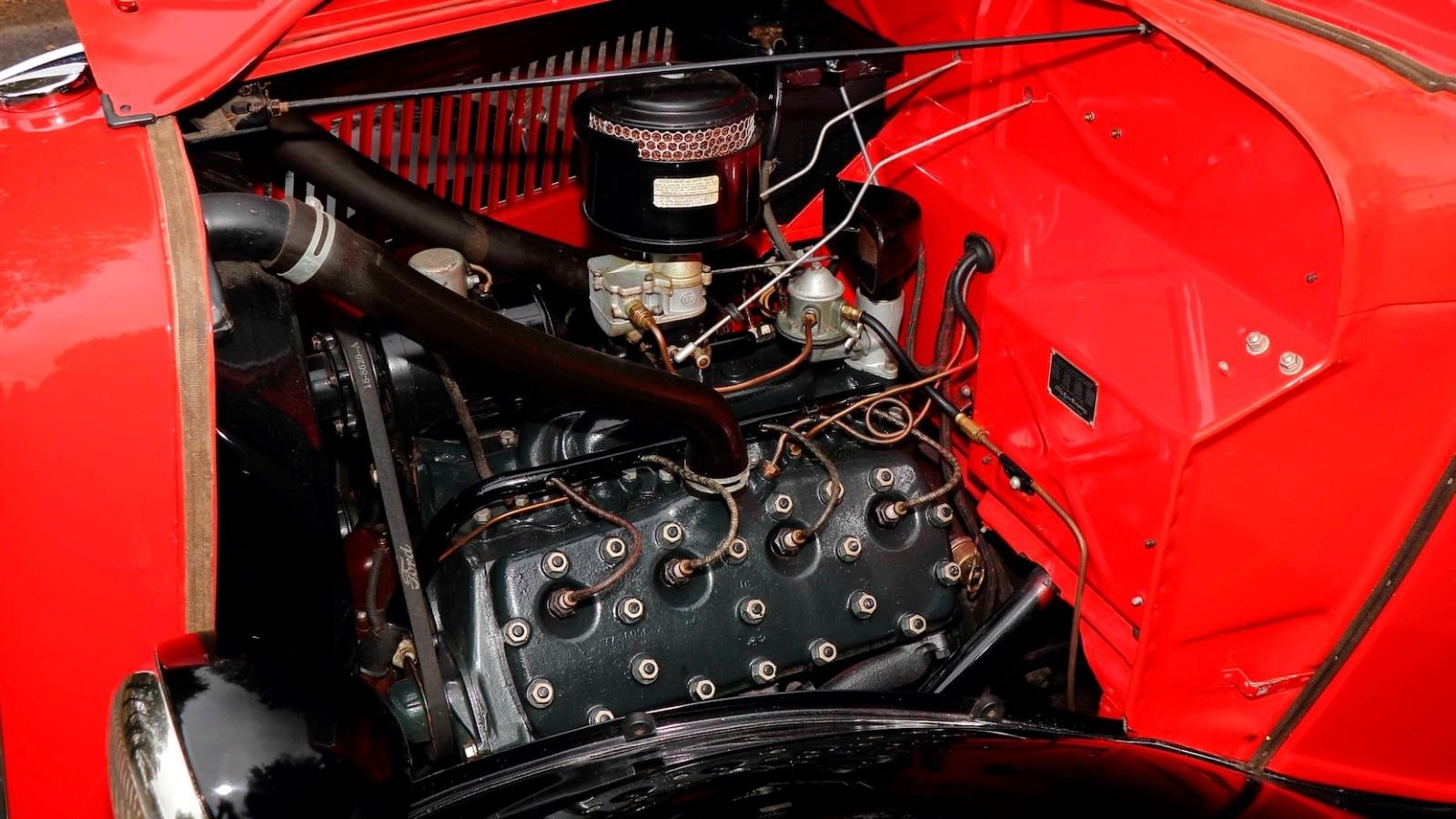 Along with the tailgate logo, a chrome radiator cap reveals what lies under the hood - a legendary Flathead V8 producing 85 horsepower. This particular example is a work of art in itself, with a high level of detail, showing off goodies including a Stromberg 97 carburetor, woven spark plug wire insulation, and Ford logo V-belt.