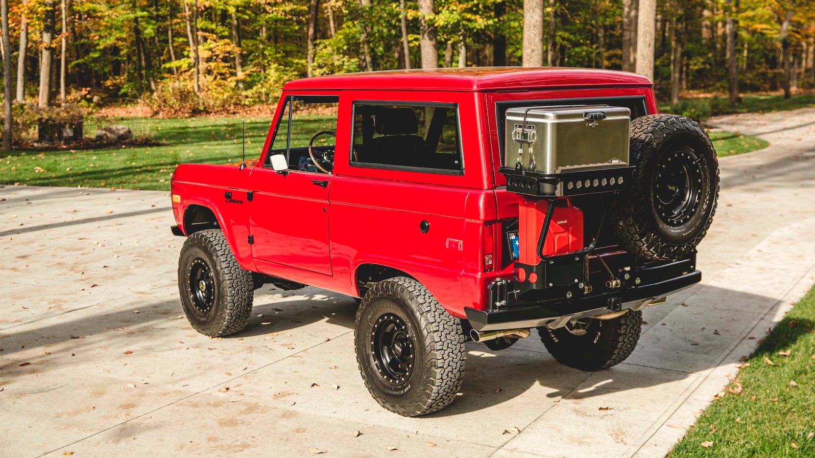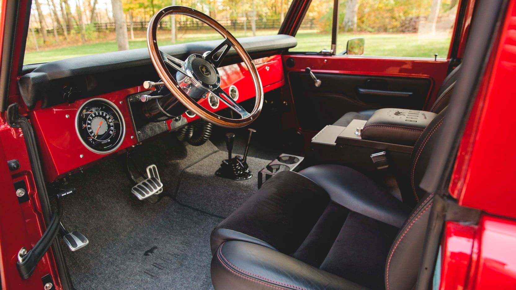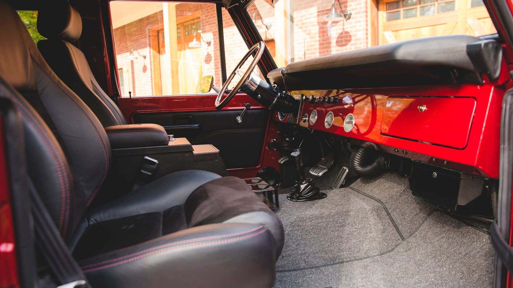 The Candy Apple Red theme continues inside and is complemented perfectly with a host of black features. That includes the ultra-comfy Porsche bucket seats, which are covered in leather and suede with red stitching. Grey wool carpet is a nice touch as well, giving this Bronco's interior another bit of depth in color.
