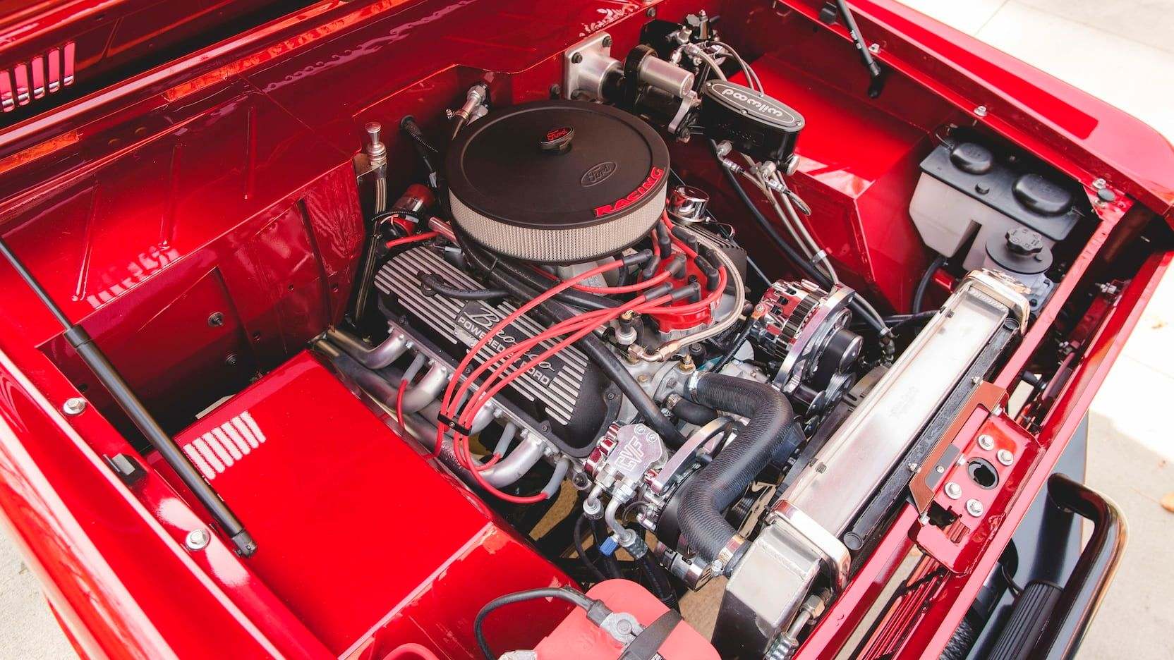 Pop the hood, and you'll find a beautifully detailed engine bay packing a modern Ford 5.0-liter V8. The engine sports a host of upgrades, including aluminum heads, ceramic-coated exhaust system, electronic fuel injection, and heat shielding. It's backed up by a four-speed automatic transmission, which sends power back to a beefy 9-inch Ford rear end and/or Dana front differential.