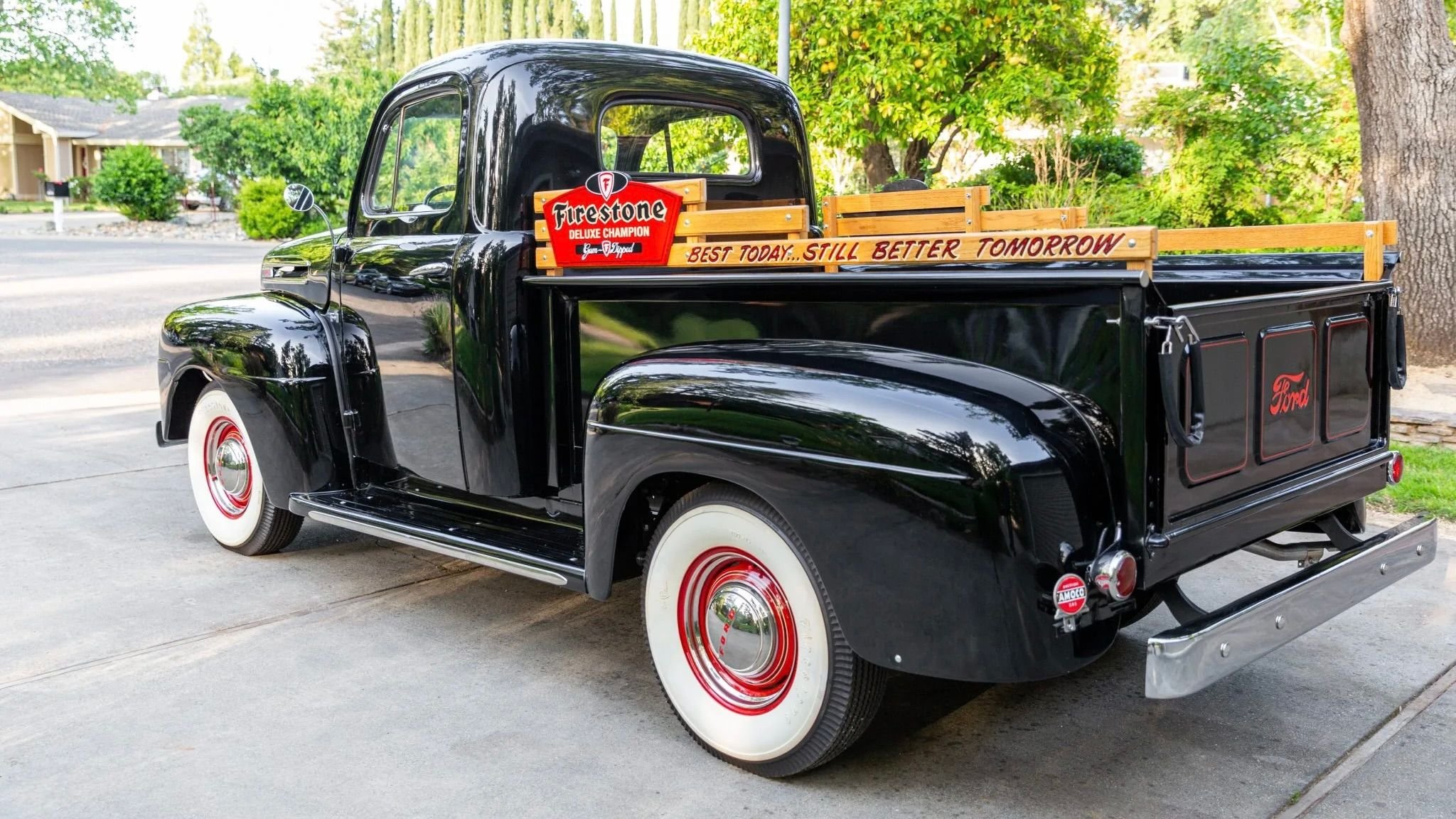 In addition to its flawless bodywork, this old F1 also sports some nifty touches including wooden bed stakes with Firestone branding, shiny chrome bumpers, a wood bed floor, a red Ford logo on the tailgate, and some old-fashioned 15" steel wheels with chrome caps and Firestone Deluxe Champion whitewall tires.