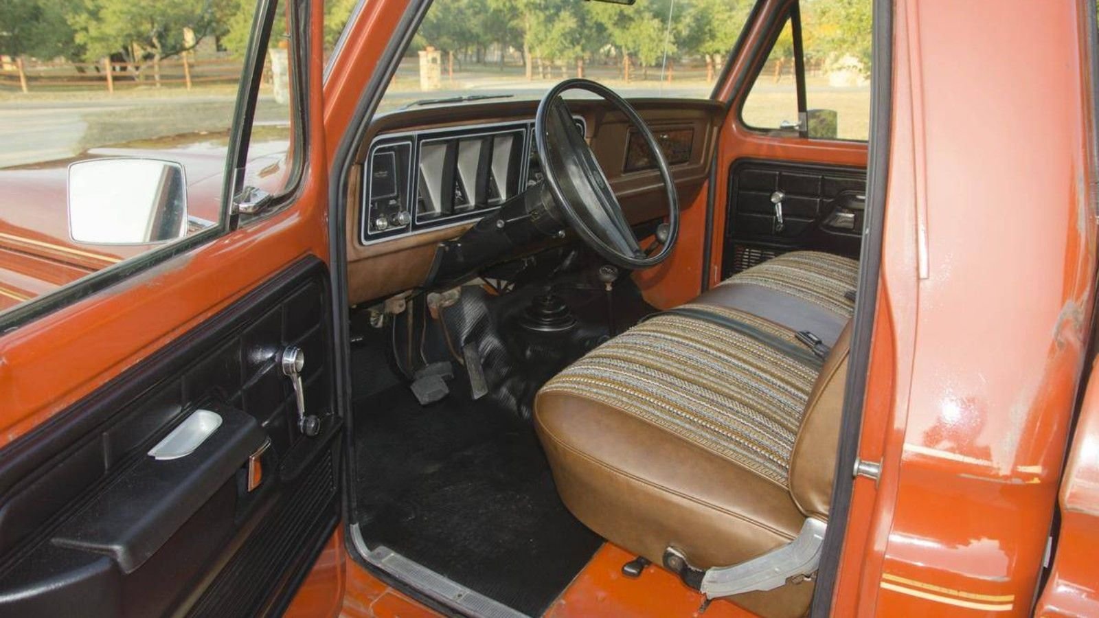 If all of that isn't '70s enough for you, open the door and take a peek inside the cabin. There, you'll find nothing short of a bunch of brown goodness, starting with a bench seat that's been recovered in the truck's original fabric. The combination of these carefully selected colors is absolutely something you don't see anymore, and likely won't again.