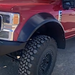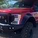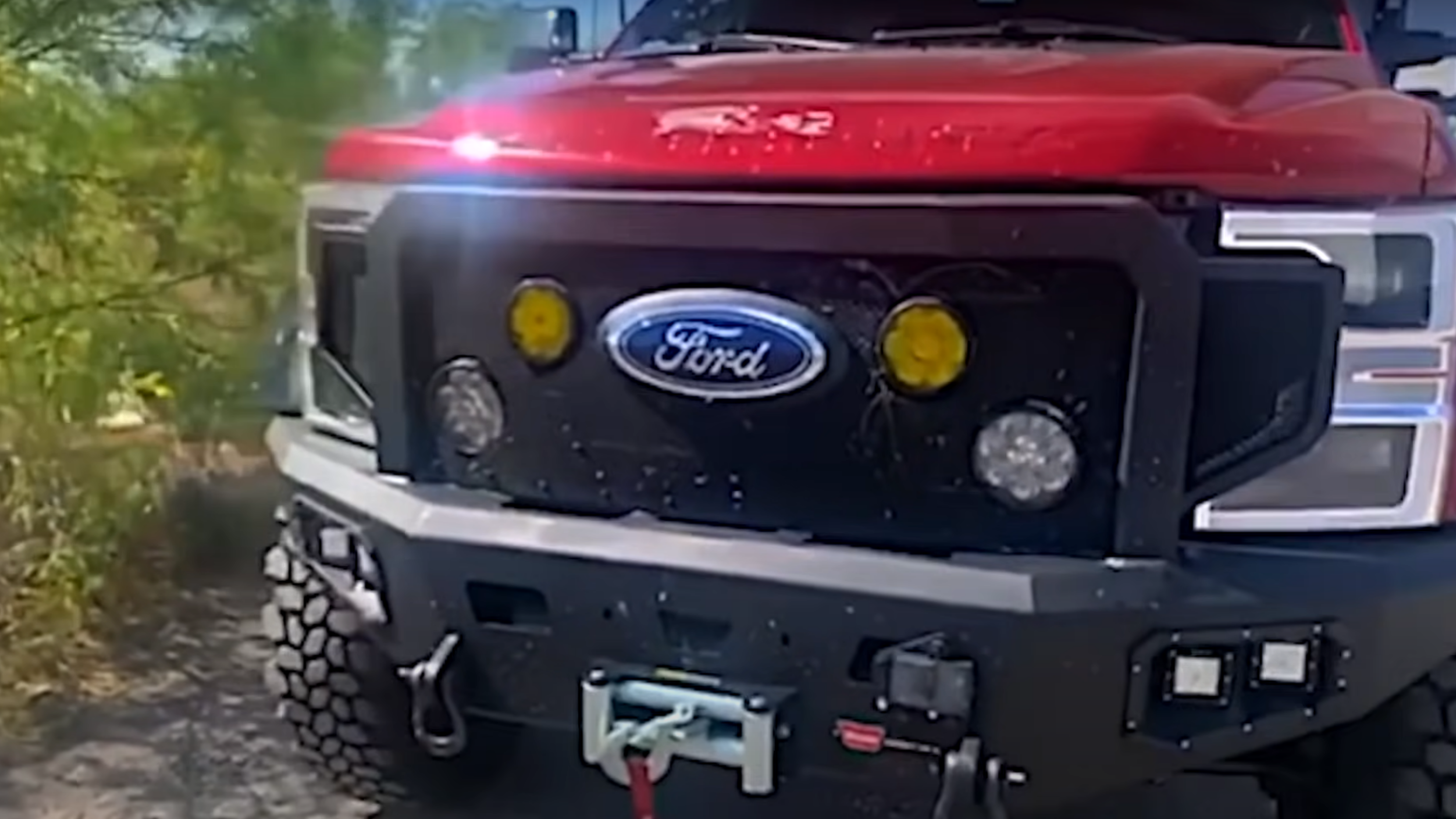 Aside from the aforementioned modifications, this Super Duty has also been fitted with an aftermarket grille with additional lighting, a heavy-duty steel front bumper with a winch and some more lights, as well as huge fender flares to cover the equally large new tires.