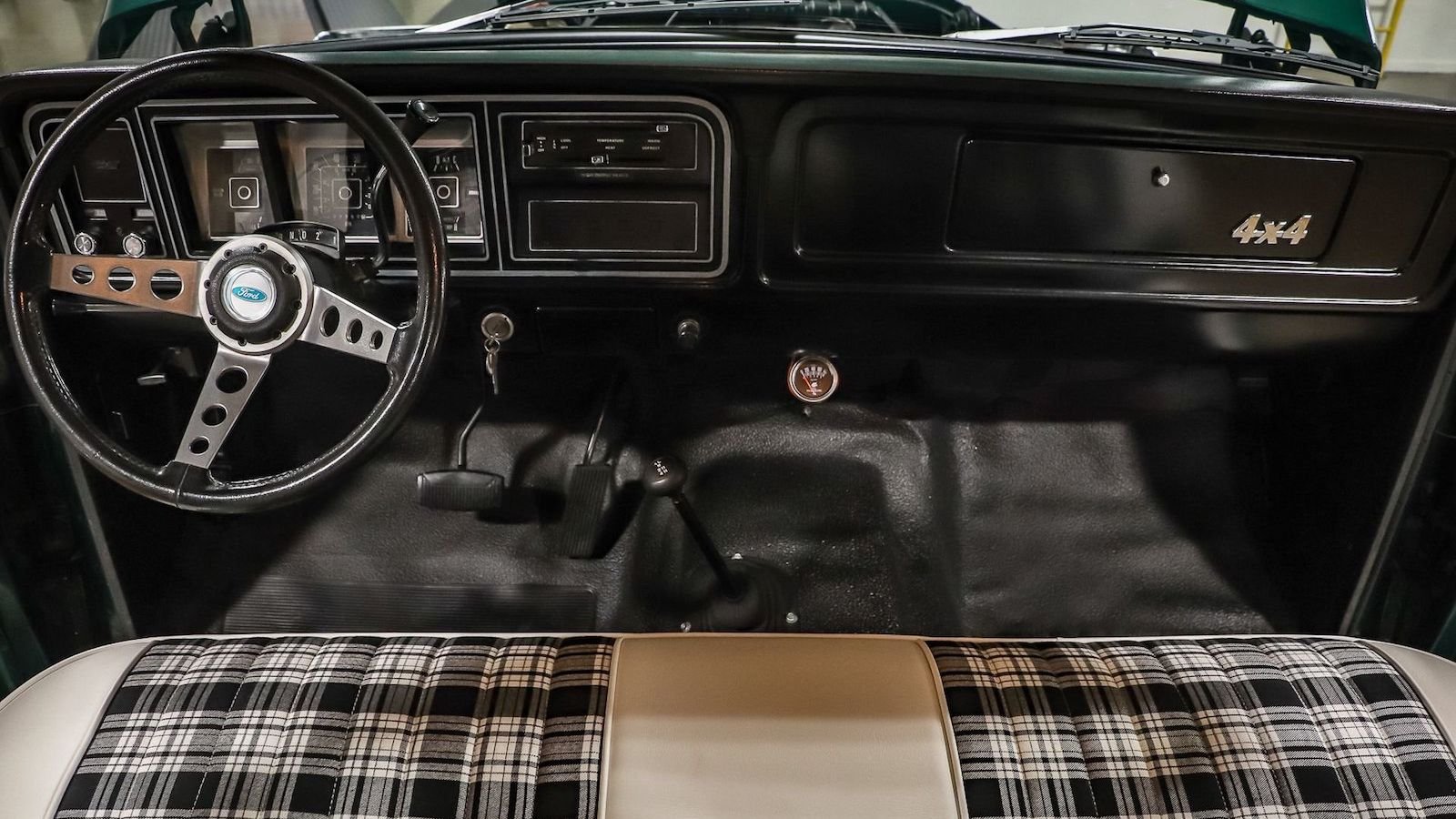 The truck's interior is as minimally classic as it gets. It maintains its original plaid cloth and synthetic leather seats, large (by today's standards) in-dash glove box, and spartan clutch mechanism. This particular truck did not come with its release year's optional CB Radio, though there is dash space for a new audio system. A three-spoke steering wheel with the recognizable blue Ford logo at its center truly ties the truck's interior together.