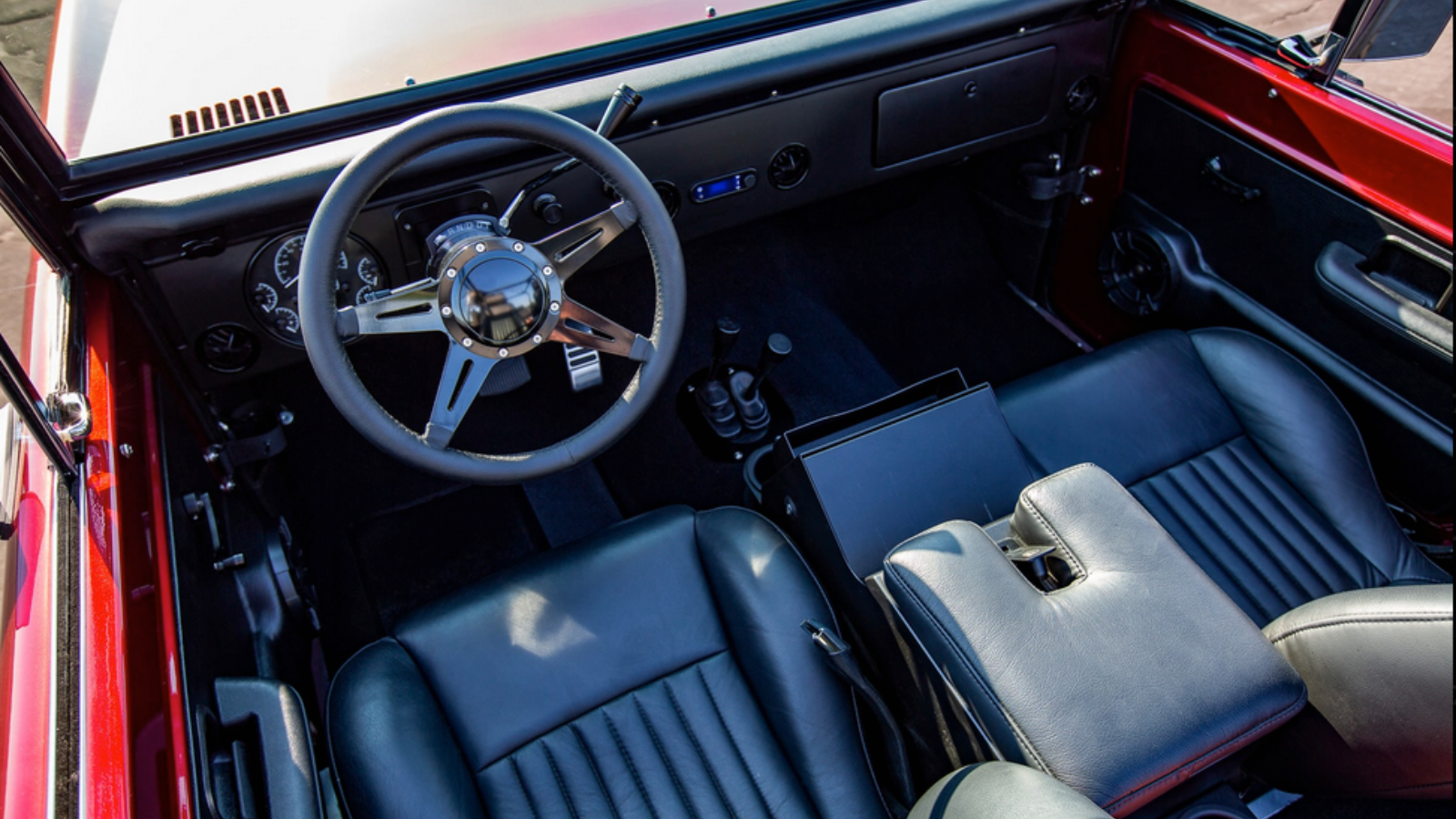 Many Ford Bronco rebuilds include upgrades to onboard audio, climate control, and seating systems. But with the Kandy Red ’71, Velocity’s team of pros have taken it one step further. The truck features retractable electronically powered steps to make getting in and out of the vehicle a cinch.