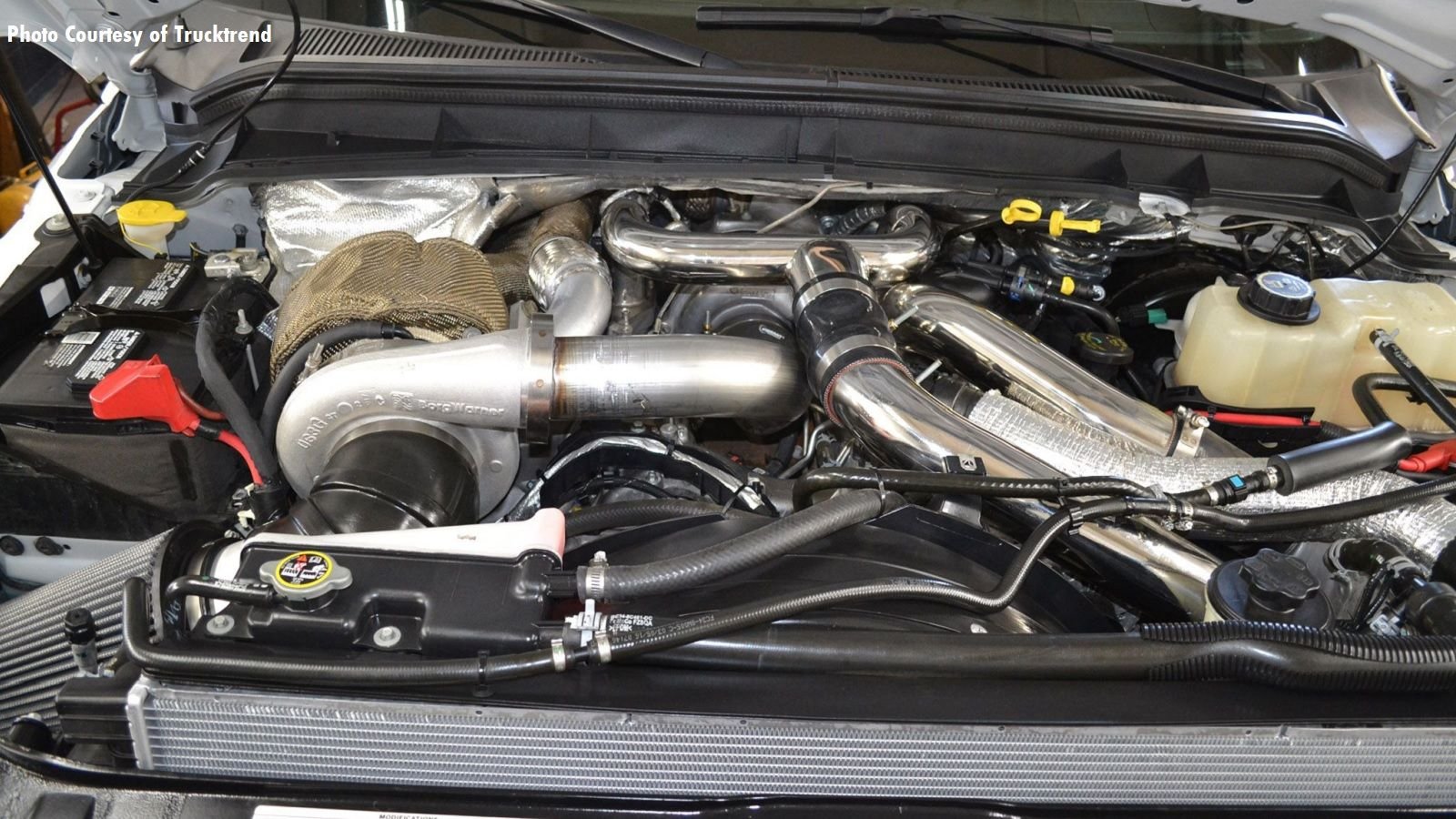 I wouldn't call the upgrades under the hood of Teasley's F-350 minimal. I don't think adding a second turbo to an engine could ever be considered "minimal". With that said, this Super Duty's engine upgrades aren't outlandish. The added BorgWarner S475 turbo feeds the stock turbo and when combined with other necessary improvements, bumps horsepower to 670 and torque to 1,350 lb-ft. All of this power is made with stock fuel injectors and unmolested internals like the camshaft, pistons, and heads. A lot of the credit goes to perfecting the flow of air both into and out of the Powerstroke motor.