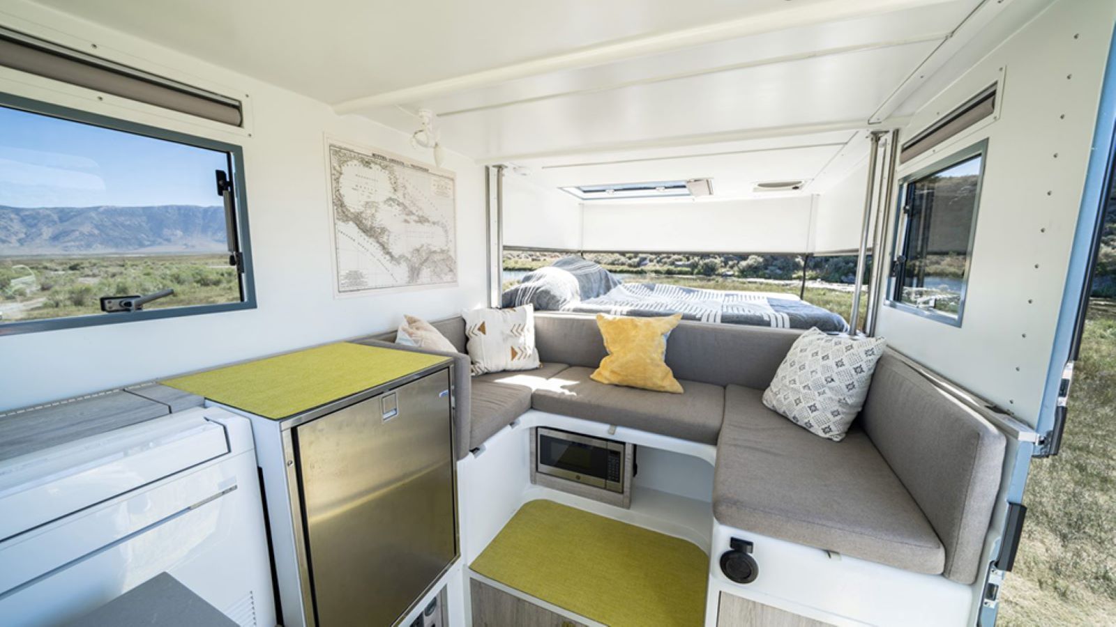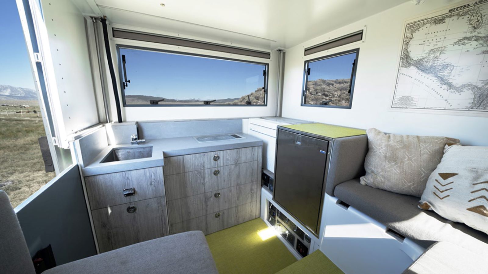 Despite being smaller than many similar overlanding rigs, Scott and his wife aren't lacking for amenities inside. There's a nearly king size bed, another kid-sized bed, and an articulating front wall to soak in all those beautiful views. The interior space is well laid out and contains pretty much everything you'd want in a portable hotel room of sorts.