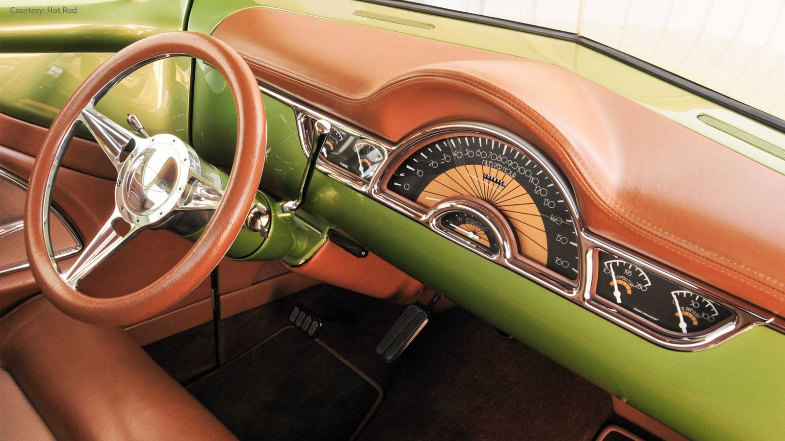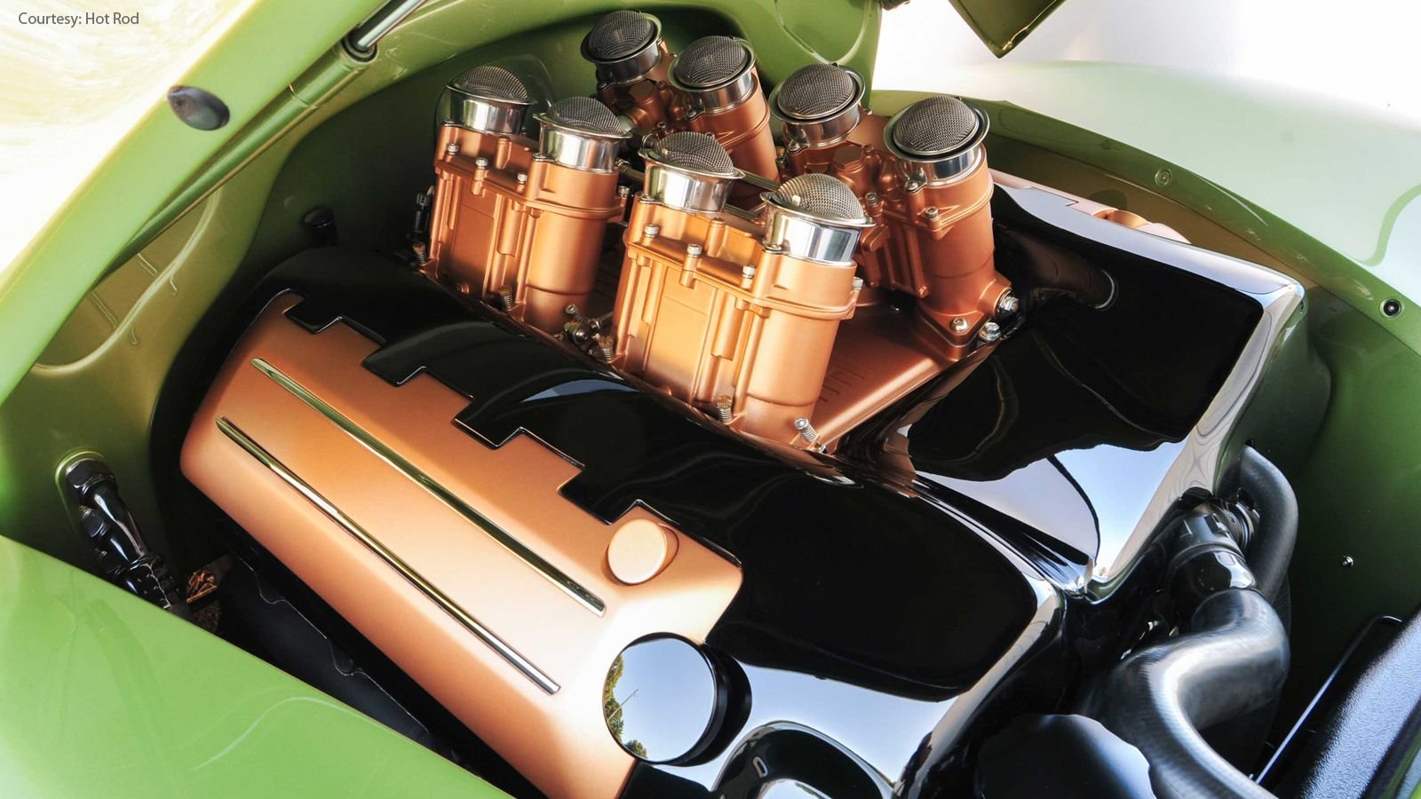 Underneath the hood, and underneath the unbelievable black and bronze cover, of course, lives a Ford 5.0 Coyote engine to power the beast. It includes Borla stack injection with FAST XFI, FAST XIM ignition, as well as Mustang headers. The exhaust system is built by the Legens shop and it uses MagnaFlow mufflers. To deal with the massive Coyote's power, a Ford 4R70W transmission has been utilized with a Lokar shifter to top it all off.