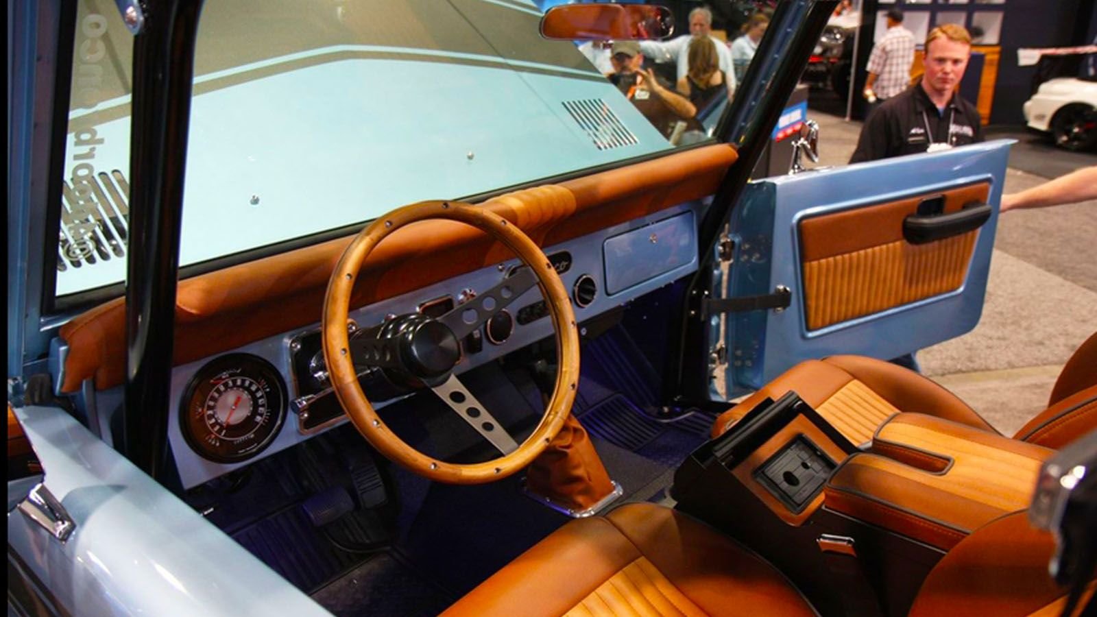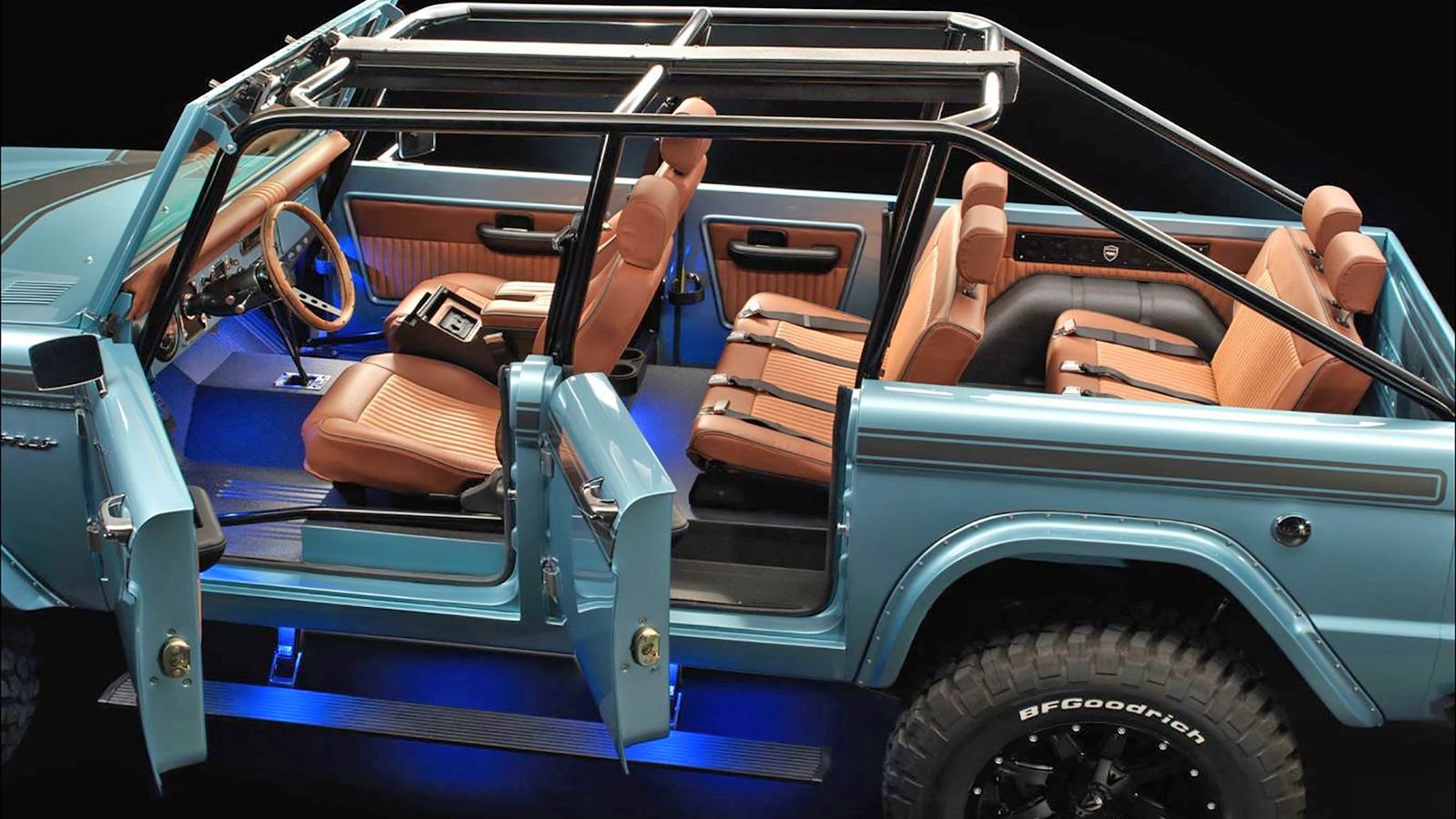 It would have been enough to restore the 1966 Bronco, bringing it back to its original glory. But with the theme of "future Bronco" in mind, they wanted to add some modern twists. They started off by adding 26 inches to the chassis in order to accommodate four doors rather than the original two. They also wanted to drop in a third row of seating, which is pretty much where this Bronco separates itself from the Jeep Wrangler that, although beloved in its own right, has barely enough room for two rows. Their idea here was to do something that hadn't been done before with other Bronco rebuilds, but also to show Ford what could be possible in mating a classic truck with modern needs and styling.