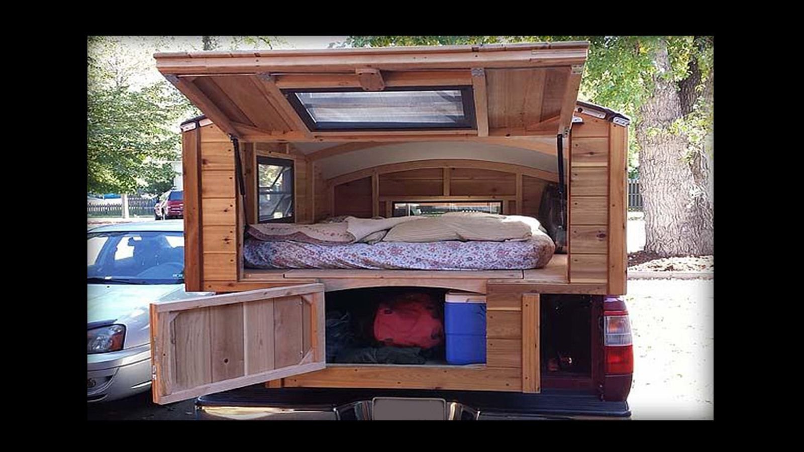 Alternatively, you can always build a camper into your bed. Camper shells are a common thing, but this is unlike any camper shell and will be awesome during your summer camping days. While the bottom works as a storage area, you can fit a queen size bed on top for sleeping. This will also save you from having to hitch and haul a camper.