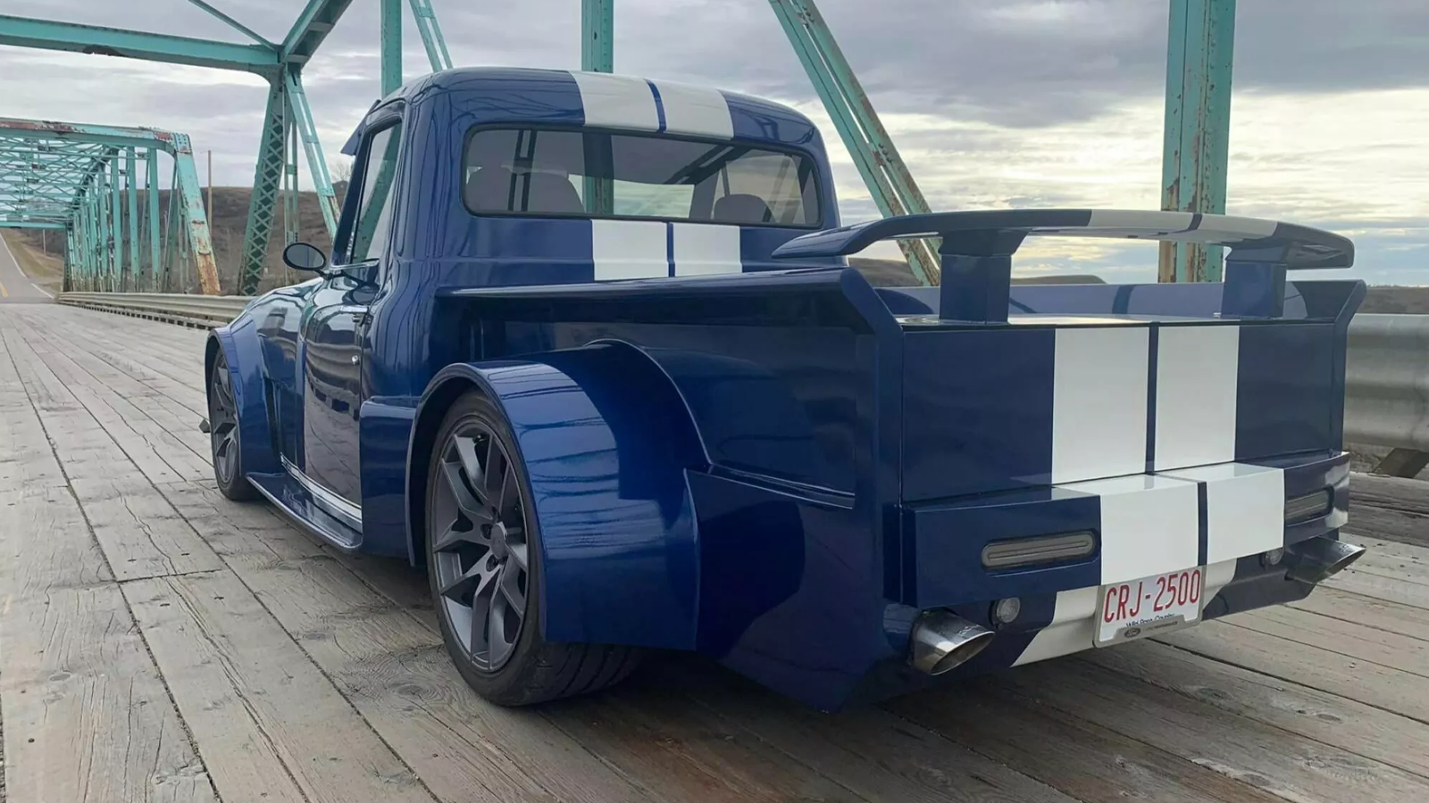The Ford Mustang Truck GT-100 sports a classic blue finish with white stripes, complemented by dark-finished alloy wheels, as a visual highlight. Inside, the dashboard, steering wheel, instrument cluster, and seats have been seamlessly integrated from the Mustang, transforming the cabin experience. The overhaul extends beyond aesthetics, as the modern chassis replaces the original F100's ladder-frame, significantly enhancing ride quality, handling, and overall performance.