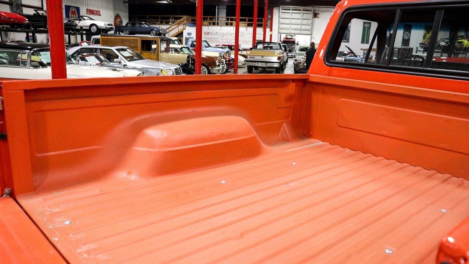 This truck has also been modified with a spray down bed-liner in an orange that matches it's new paint scheme. Other exterior changes that differentiate this truck from the 1978 model included new rectangular-style headlights and new grille options available in either black or chrome. Flareside bed styles were made available in 1979 F-100, F-150, and F-250 models with the F-100 like this one receiving the “shorty” box that's only six-and-a-half feet long.