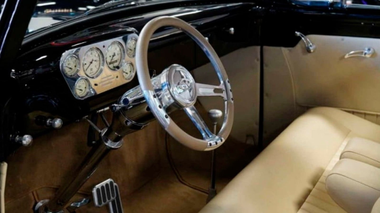 The Gray and Silver leather interior looks fantastic. But what stands-out inside is the billet aluminum dash panel with custom gauges. Music lovers will also be interested in the Retro manufactured radio and major sound system.