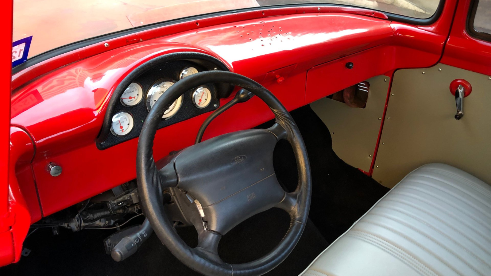 Inside, a sharp red dashboard (plaid off clean beige door panels) houses a newly-installed contemporary audio system and digital gauge cluster. The recognizable Ford Explorer steering wheel is a nice upgrade from the original wheel from '56, while driver and passenger ride along on comfortably upholstered bench seat.