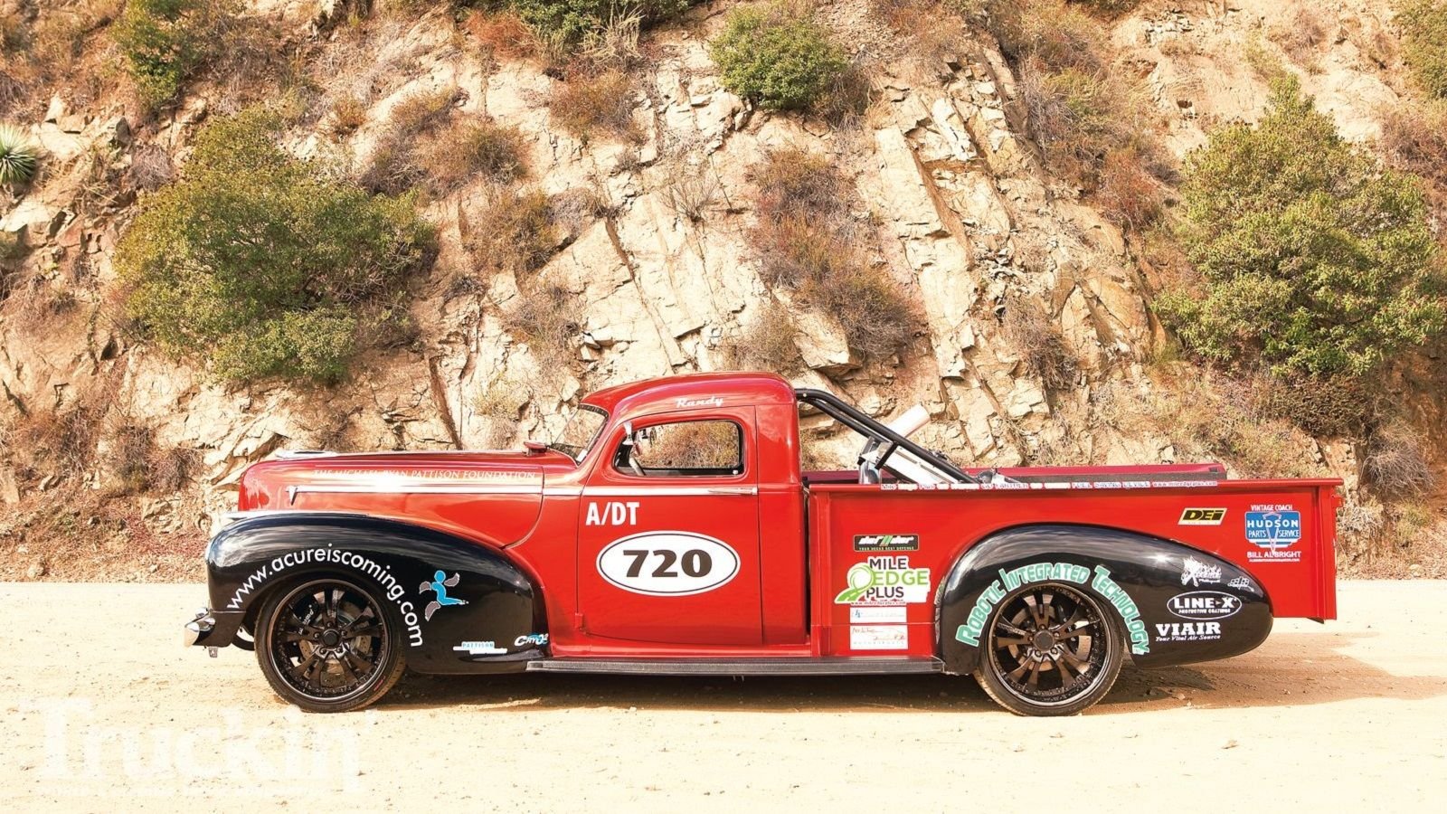 To tame the 5,500 pound, 1000 horsepower machine, Simmons built a custom chassis to make sure the Hudson truck handles and stops as quickly as it can get going. The front suspension uses tubular upper and lower control arms, while the rear-end is a 9-inch Ford floater with a triangulated four-link, all of which are of Simmons' own design. Mix in huge 6-piston brake calipers and oversized swaybars, and the truck should be capable of carving a corner with the best of them, even at triple digit speeds.