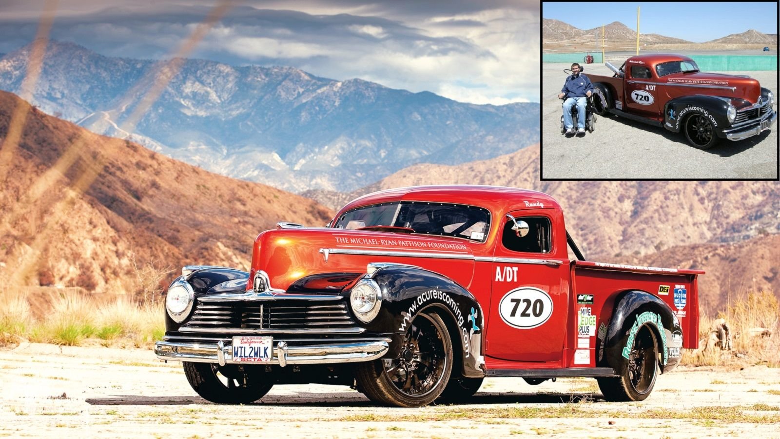 The story comes full circle as Michael-Ryan Pattison, a quadriplegic himself, piloted the Hudson Truck alongside Randy Simmons in a land speed event in the Mojave Desert. To date, the truck has raced in a number of events, has been featured in several auto magazines, and can occasionally be spotted at auto shows throughout the US. The idea is to eventually put on special events that will allow individuals with spinal chord injuries to have a go behind the wheel of the Hudson Pickup.
