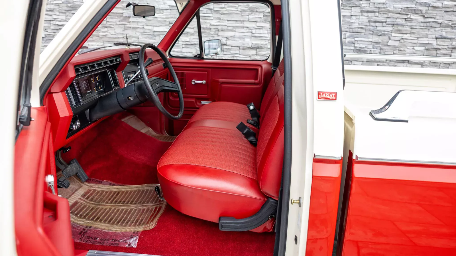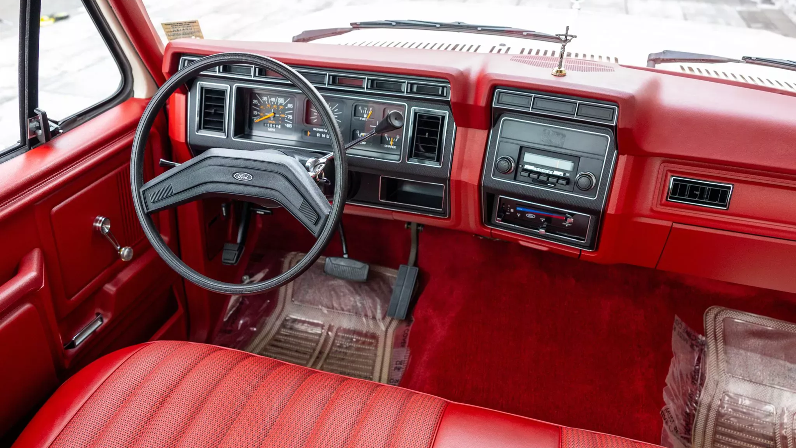 Finished in Wimbledon White over a Candyapple Red interior, the truck presents as a near-perfect snapshot of 1983. The chrome trim remains bright, the paint retains its factory sheen, and even the original 15-inch wheels wrapped in General Steel Radial tires are still fitted.
