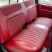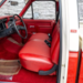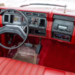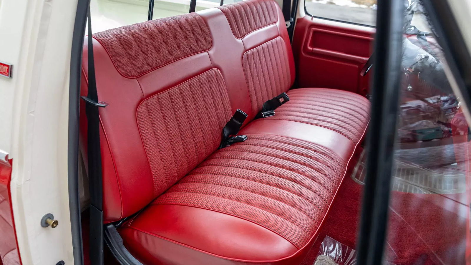Inside, the cabin is trimmed in bright red vinyl across the bench seat, door panels, dashboard, and carpeting. Equipment is period-correct and refreshingly simple: an original AM/FM radio, factory air conditioning, power steering, and a two-spoke black steering wheel.
