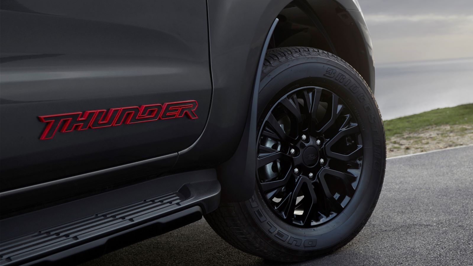 From there, the rather dark Thunder gains some contrast with red accents on the grille and roll bar, three-dimensional "Thunder" badges on the driver and front passenger doors and tailgate, and a matte black Ranger logo. The Thunder also wears darkened bezels on the headlights and taillights. A bed liner, Black Mountain Top powder-coated roller cover, and bed divider also come standard.