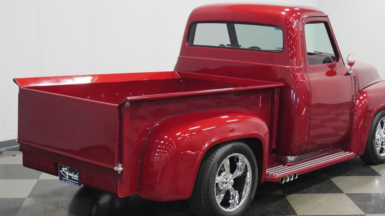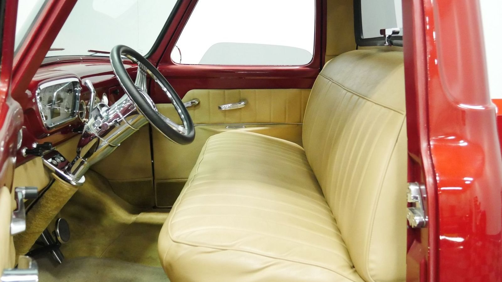 The truck's short bed has been reborn to mint condition and certainly isn't one you'll want to load up with clean fill anytime soon. The bed has been upgraded with real wood flooring —premium "Bird's Eye" maple to be precise. Thanks to chrome inlays, it's an incredible look, particularly when played off the truck's glossy red paint job.