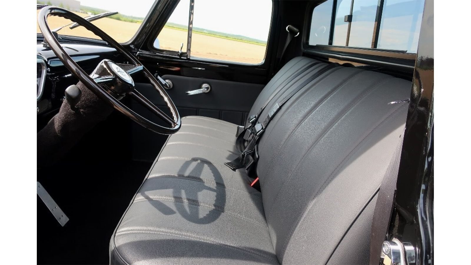 As is evident in the photos, the Mercedes-Benz elements are all hidden and tucked away. The appearance of the truck screams nothing but classic Ford. The interior still retains most of its original character, as well, with grey leather bench seats and body color dashboard. The gauges are modernized, though they maintain a vintage look and feel.