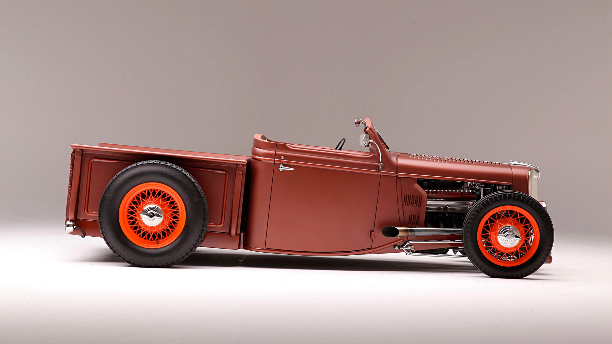 Lopez kept the stock one-tone rails from the truck’s forward cab, opting instead to fabricate a shortened rear section while adding new rear cross members. It was then out with the water tank and original commercial hardware and in with a Magnum 5-inch drop axle with Speedway’s hairpin radius rods, tube shocks, Lincoln-style Bendix brakes, and Vega cross-steer. Before long, the figurative fire was just beginning on this hot-rod.