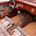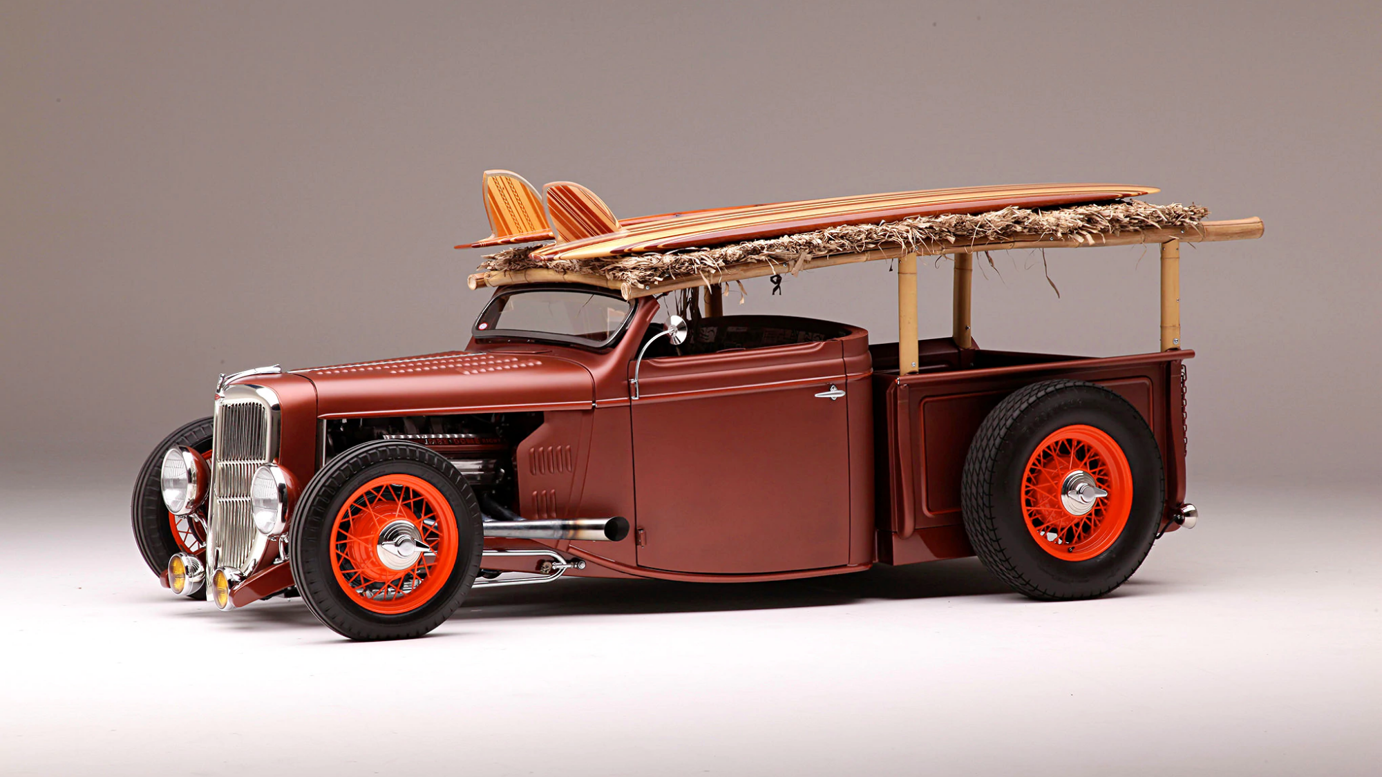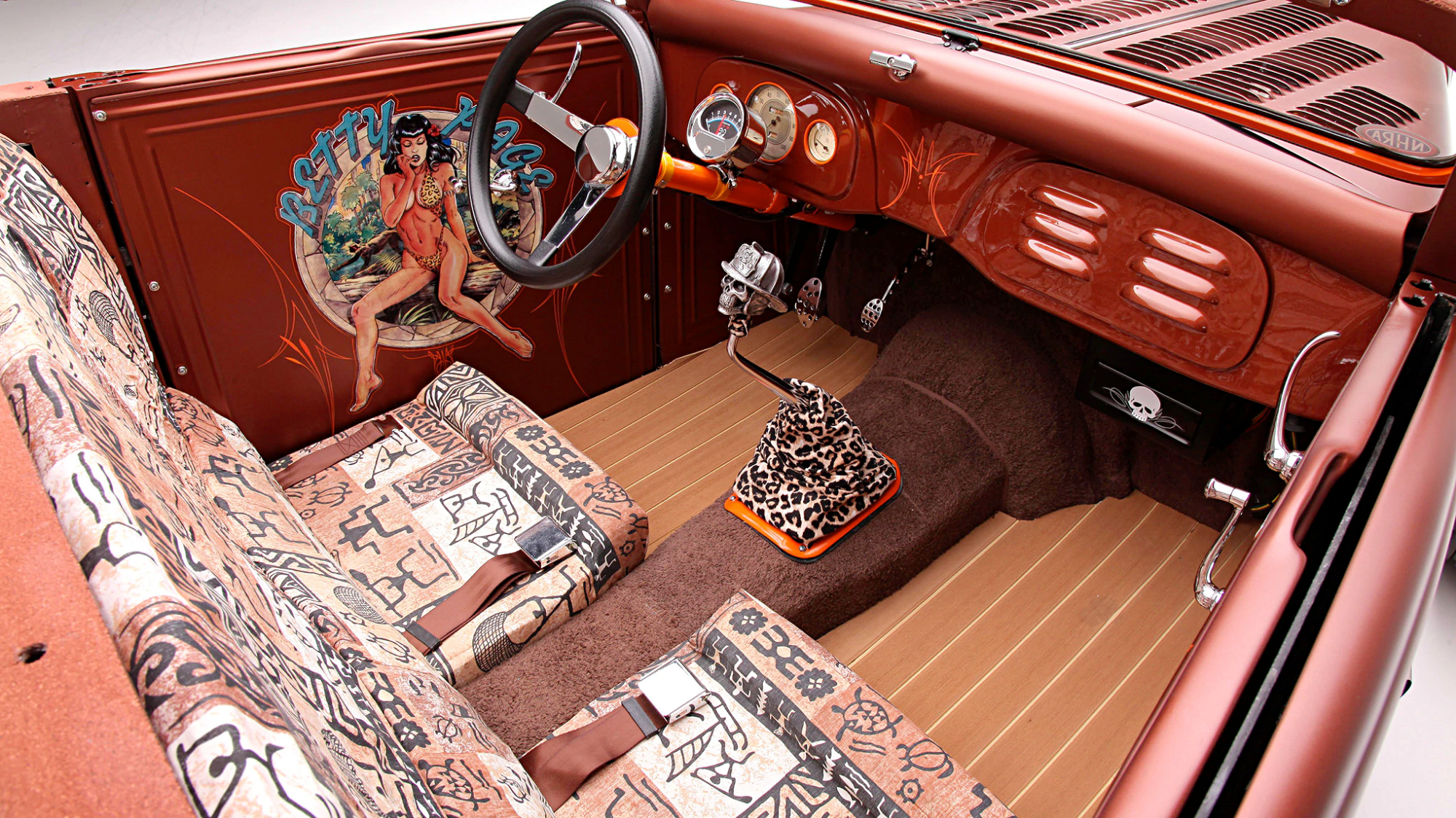 This old horse buggy turned hybrid surf rod was finished in a satin burnt copper with contrasting orange and outfitted with Firestone bias blackwalls from Coker Tire. The interior features a Tahitian print-covered, scratch built split bench seat and pinup-airbrushed door panels and wood panel–looking carpet.