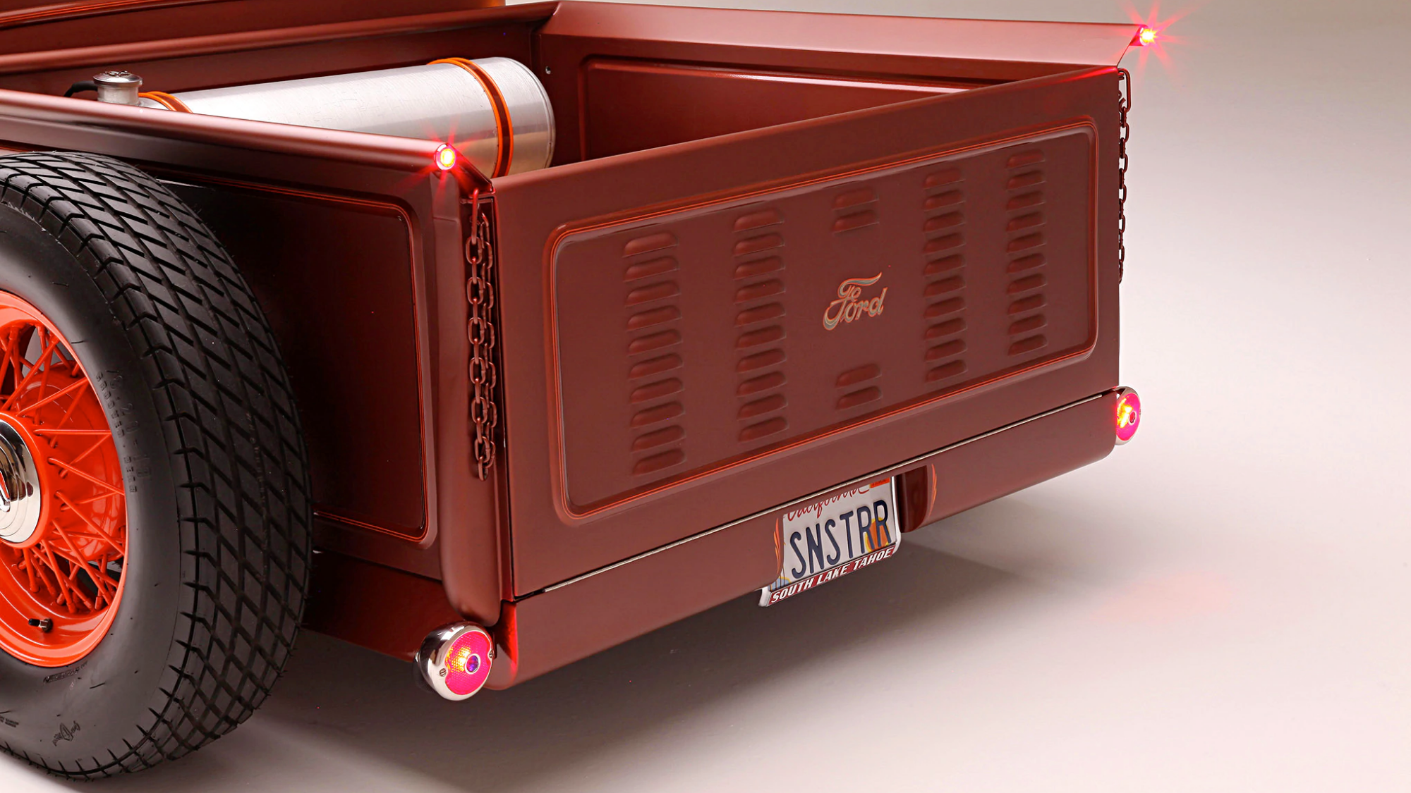 When all was said and done, Lopez’s new surfboard-toting hot rod was ultimately channeled 5 inches, with its stock grille (you read that right —stock grille) sectioned 4 inches and reshaped with a Ford Model 40 manner. Lastly, the roof was made removable from the windshield header back—ideal for roadster weather.