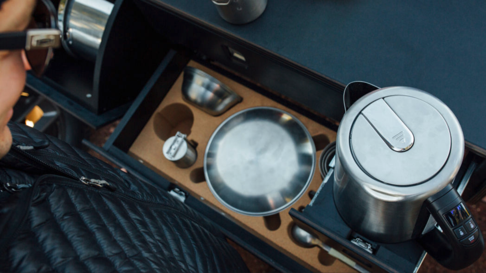 At first glance, one might be curious about how one might clean up from a hearty meal prepared aside a trailhead or in a remote forest, but Rivian designers have thought that through. The pop-out camp kitchen is comprised of a two-burner cooktop and includes a small sink and water heating element. After all, bears like leftovers too.