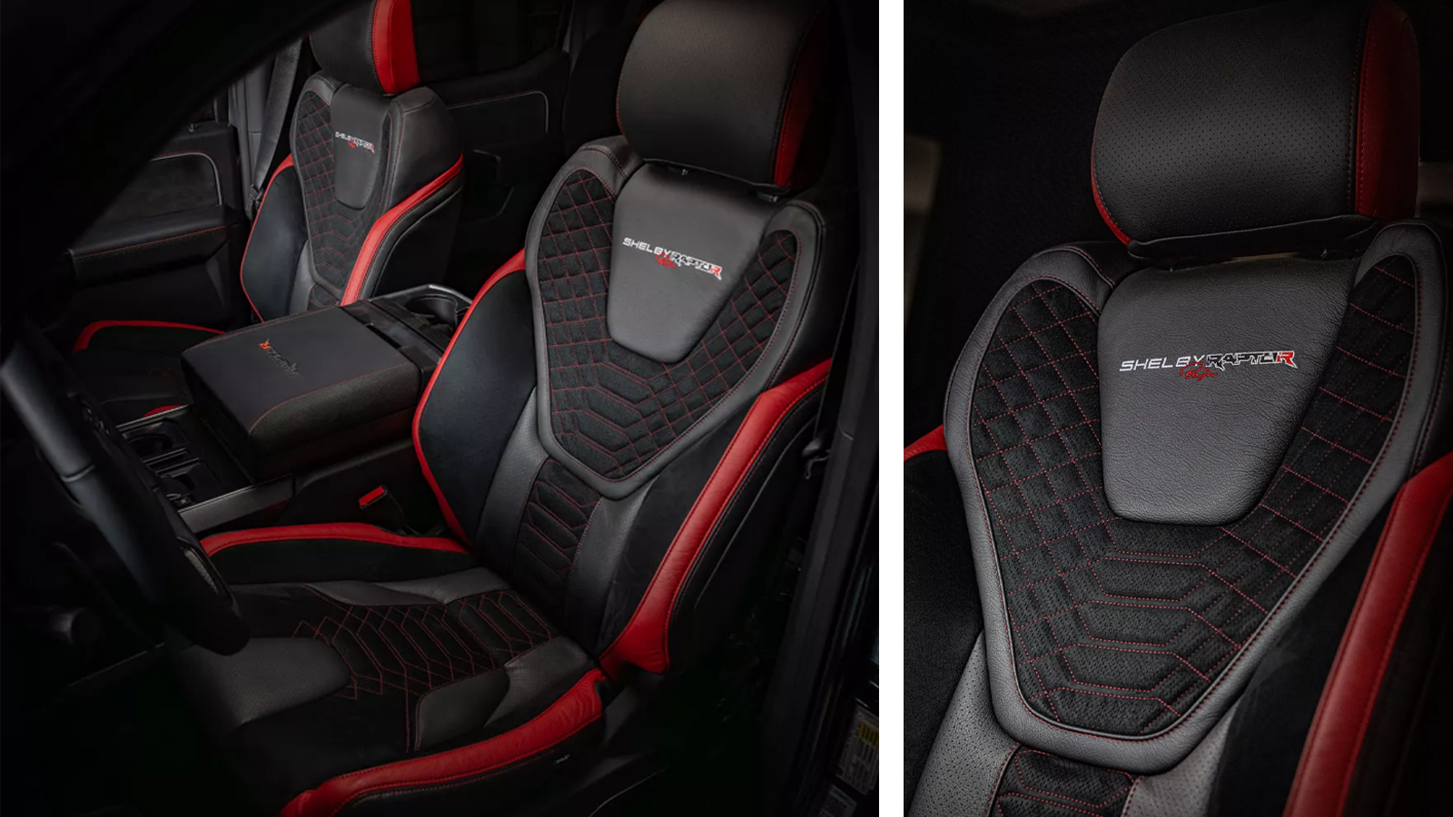 Shelby has also given the Baja Raptor an aggressive exterior makeover, from the custom steel chase rack with integrated LED light bar to the revised hood, grille, and bumpers. These upgrades are not just for show—new functional vents help keep the engine cool, and the truck's wide-body look reflects its enhanced performance. Additional touches like billet racing pedals and black-and-red leather-trimmed seats with custom embroidery ensure that the interior feels just as special.