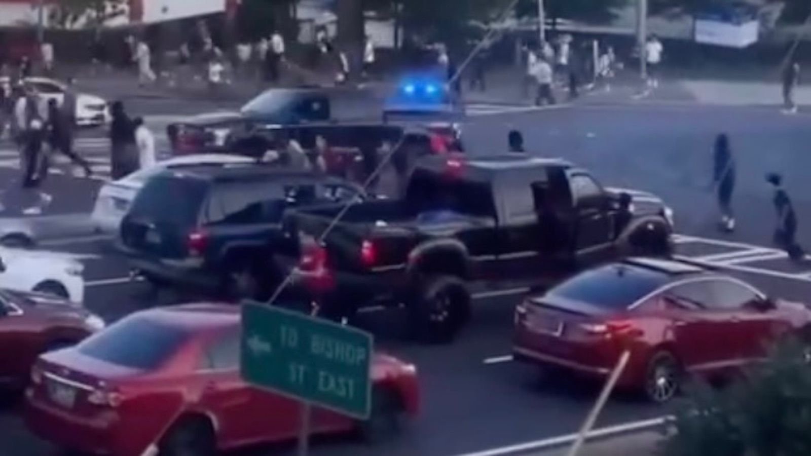This particular street takeover took place in a four-way intersection in the West Midtown area of Atlanta recently, and when the video commences, we can clearly see the black F-150 doing donuts in the middle of that intersection. A large crowd has gathered to soak in all the action, but unluckily for them, a Georgia State Police trooper was nearby and spotted what was happening.