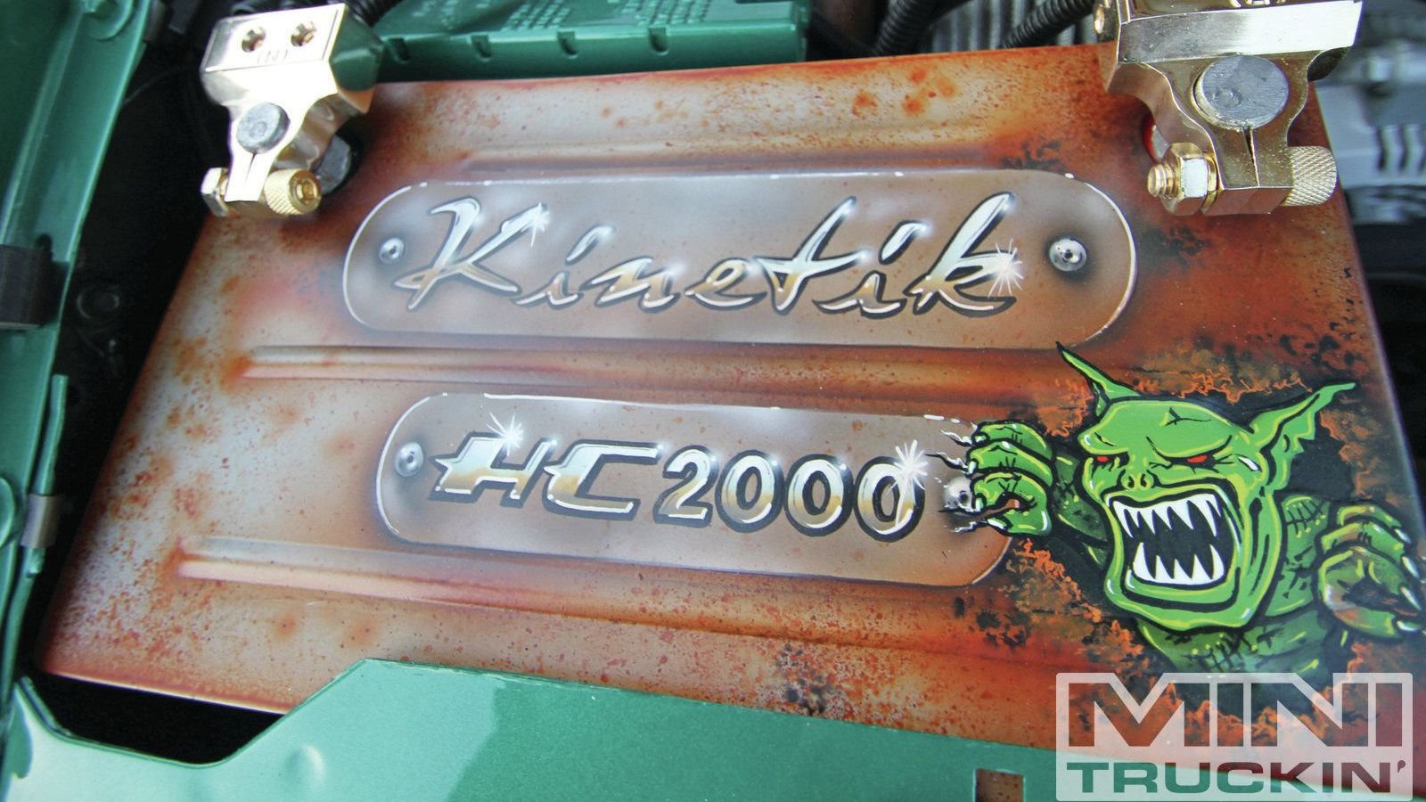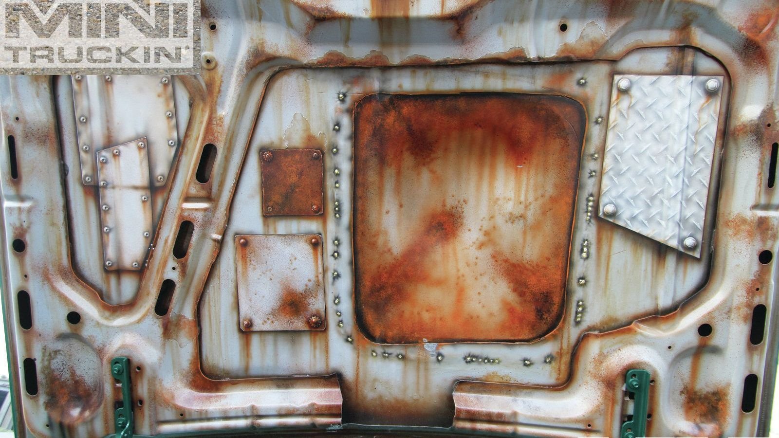 Getting close, you can see some of the faux screwed, bolted, or riveted-on plates aren't as 3-D as they seem from a few paces away, but otherwise, it's almost impossible to tell the oxidation and rust stains from the real thing. The illusory airbrushing on the Ranger's bed, the underside of its hood, and inside the cab was performed by Tad "Fat Daddy Tadpole" Gallaugher. Wells himself applied the custom-mixed PPG metallic green paint.