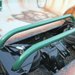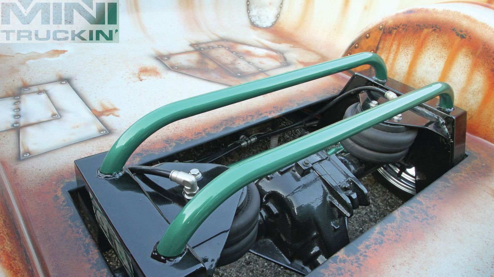 The body was dropped three-and-a-half inches and sits on Slam Specialties SS-7 ’bags front and rear. The front DJM I-beam suspension mounts to the custom tubular bracket and the frame was notched for tie rods. In back, a custom tube bridge was added to tie the raised sections of the frame together. The frame itself was finished in black with suspension pieces receiving green paint, matching the exterior color.