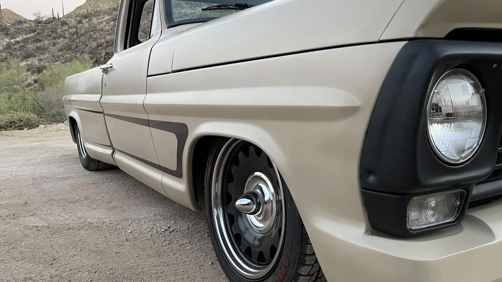 Otherwise known as a Bumpside for its distinctive side spear, the half-ton Ford left the factory as a long-bed work truck. Somewhere along the line, that destiny changed—although no build date was provided. American Outlaw Garage in Las Vegas, Nevada performed the numerous custom modifications, which included shortening the bed and copious amounts of molding.