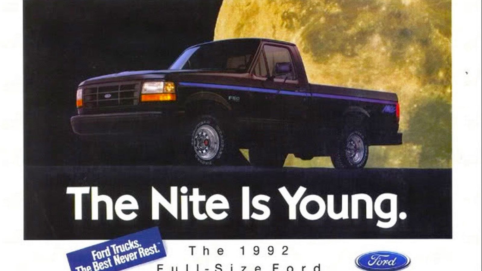 Ford's 1991 and 1992 offered a special appearance package that was about as 90s as can be, with a multi-colored magenta to blue stripe down the side of it. At first, this was just a sporty regular cab, short bed model, but later it became more widely available, including on Broncos, 4x4s and even the Flair Side (which is as rare as a unicorn these days). All of them came with V8 motors, and polished alloy wheels standard, plus typically pretty nicely equipped interiors. The 1st generation Lightning seems to have taken the Nite and run with monochrome sport truck theme. The Ford-Trucks.com site has a special section just for owners of these trucks, the aforementioned NASCAR edition, and other rarities, which you can find here: Nite, Nascar & Other Limited Edition Ford Trucks.