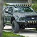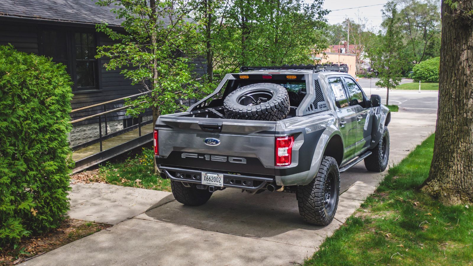 Next up, Mil-Spec gives the F-150 a more menacing look with new and rather wide fiberglass front and rear fenders, a new grille, lots of off-road lighting, a push bar, powder-coated bumpers, side steps, and a slew of graphics. An available Baja appearance package adds a bed-mounted chase rack and spare tire, along with a low-profile roof rack stuffed with more lighting.