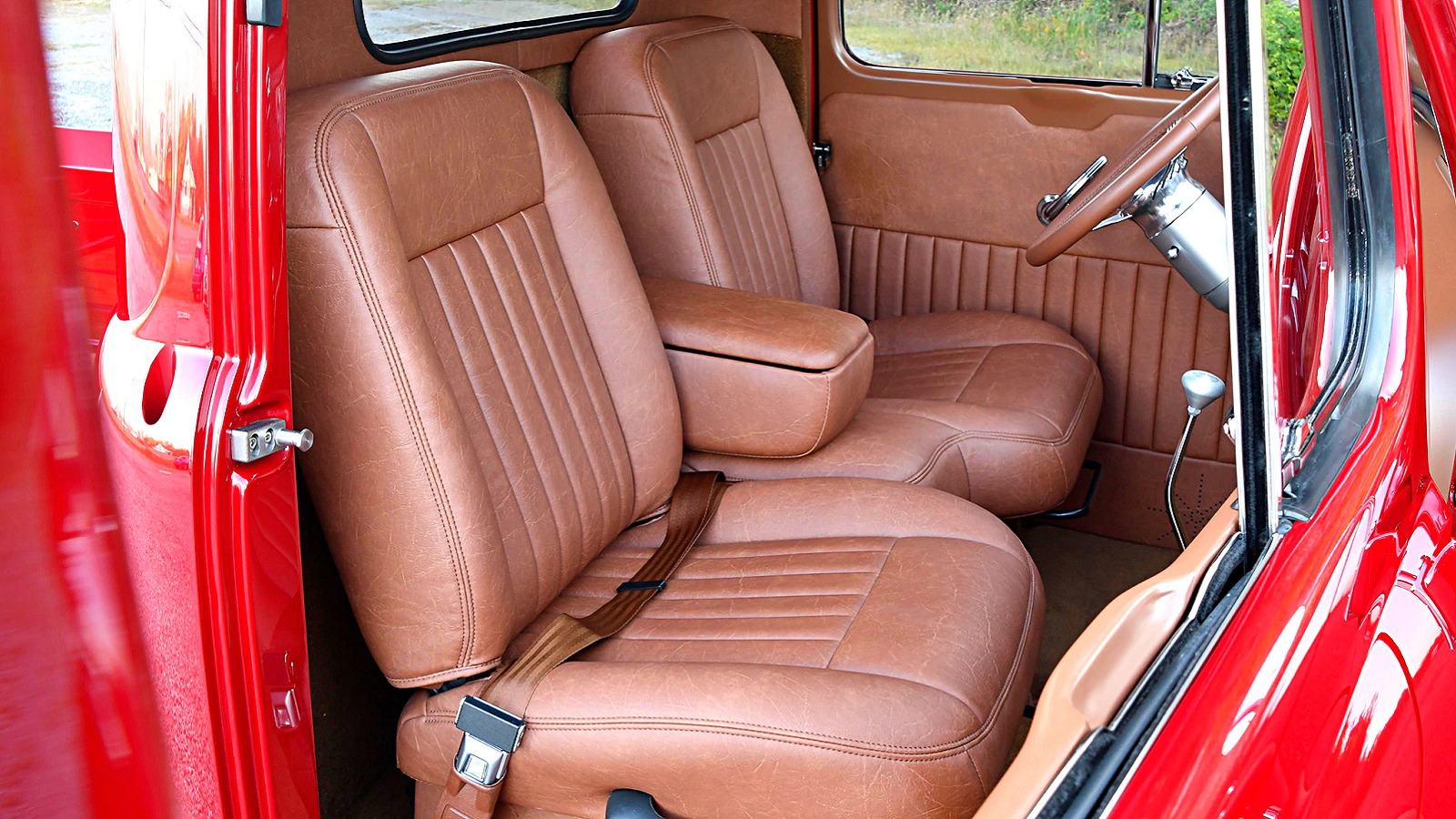 As good as the engine bay looks, the interior arguably looks even better. Saddle Brown leather covers a Ranger split bench seat, which is surrounded by contrasting PPG Deltron Sienna Brown. Pretty much everything else that could be covered in that delectable leather was, while AutoMeter gauges and a classic "banjo" steering wheel give this truck's interior a timeless look.