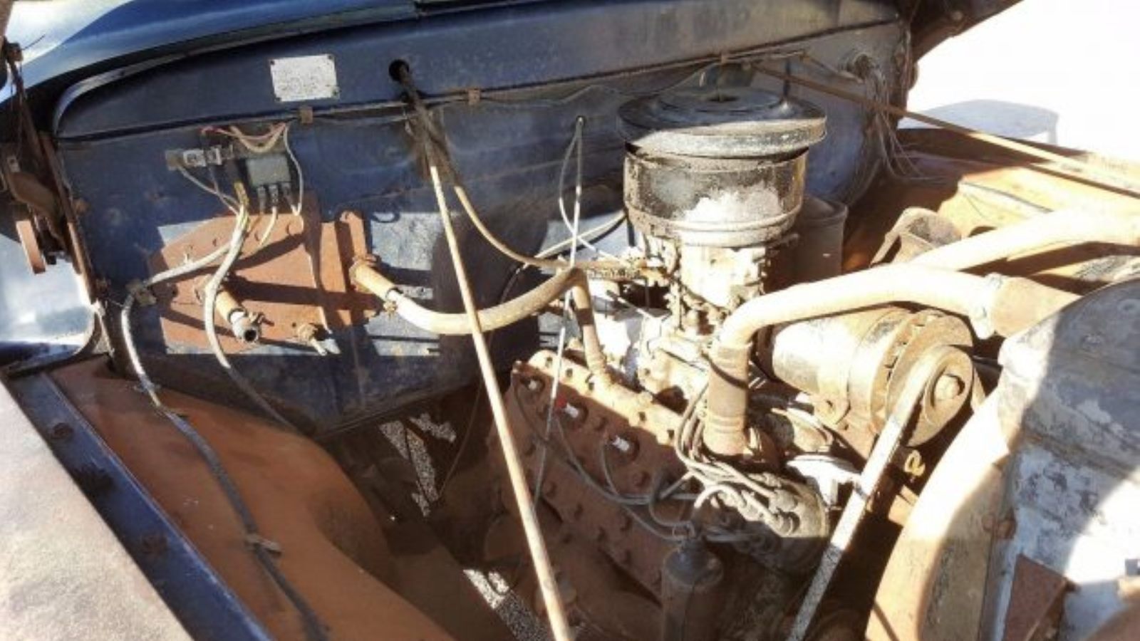 Under the hood, you will find a Ford flathead V8, and from the photograph, it appears that the power plant is original and well-used. Flatheads are reliable and rugged engines that Ford manufactured from 1932 until 1953, making the engine's 21-year production run for the U.S. consumer market longer than the 19-year run of the Ford Model T engine for that market. The engine was on Ward's list of the 10 best engines of the 20th century and they are still hot rodded today, with a special land speed record class for flathead engines.